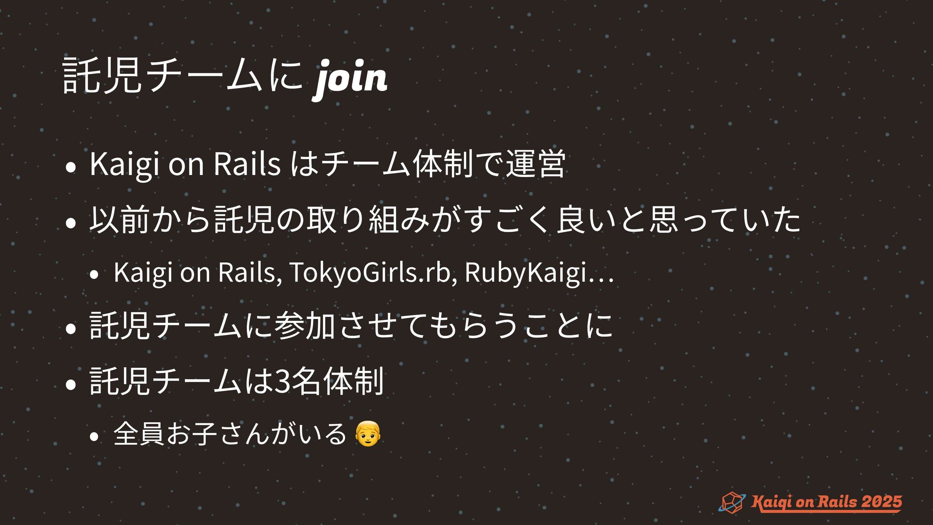ୗࣇνʔϜʹ join • Kaigi on Rails はチーム体制で運営 • 以前から託児の取り組みがすごく良いと思っていた •