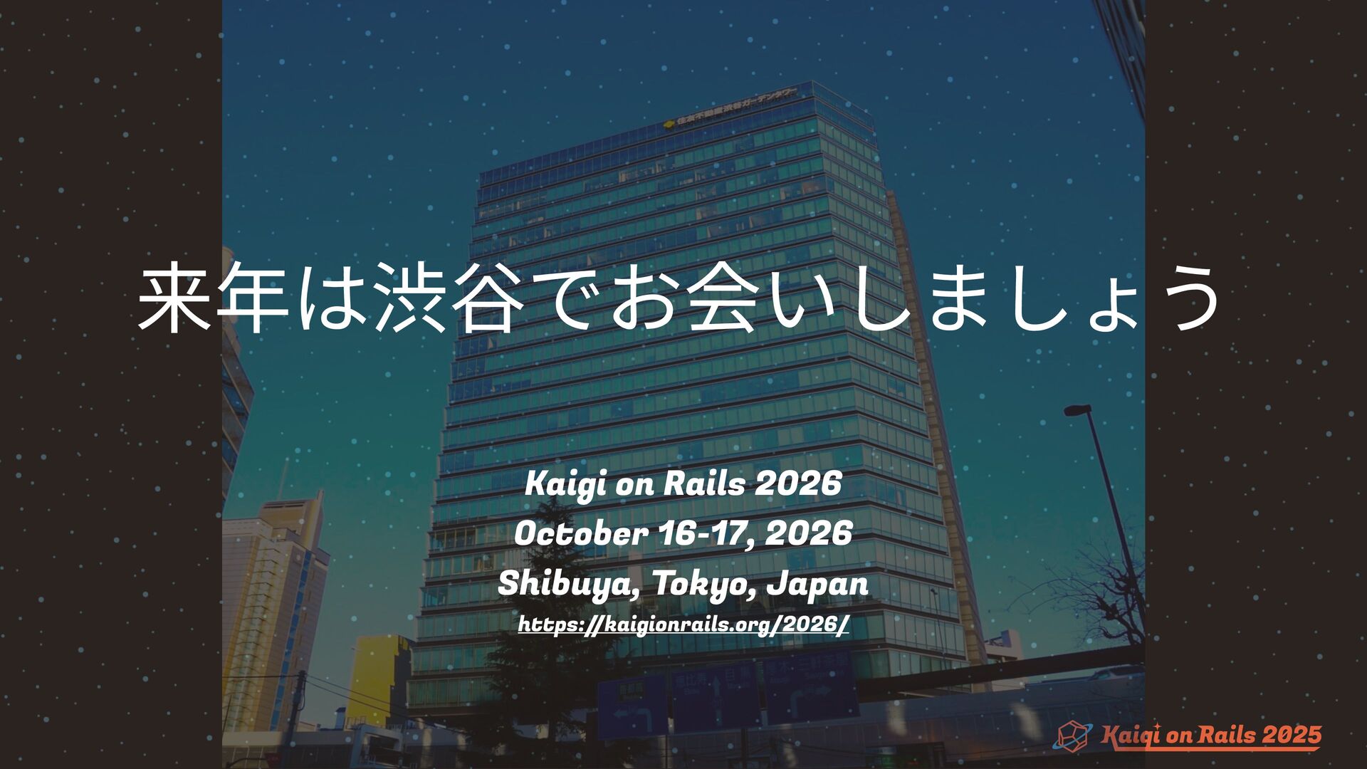 来年は渋 谷 でお会いしましょう Kaigi on Rails 2026 October 16-17, 2026