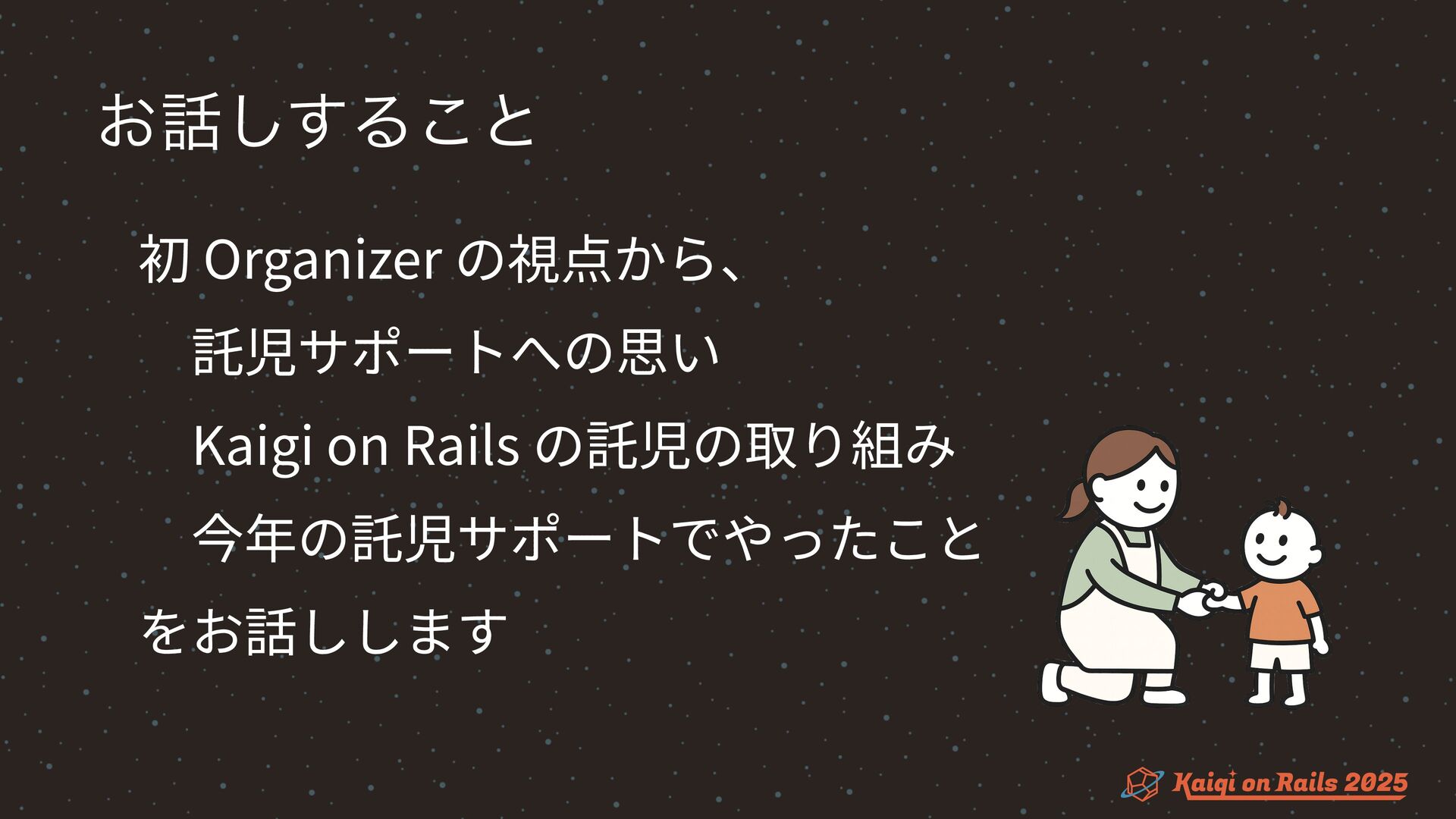 ͓͢͠Δ͜ͱ 初 Organizer の視点から、 託児サポートへの思い Kaigi on Rails