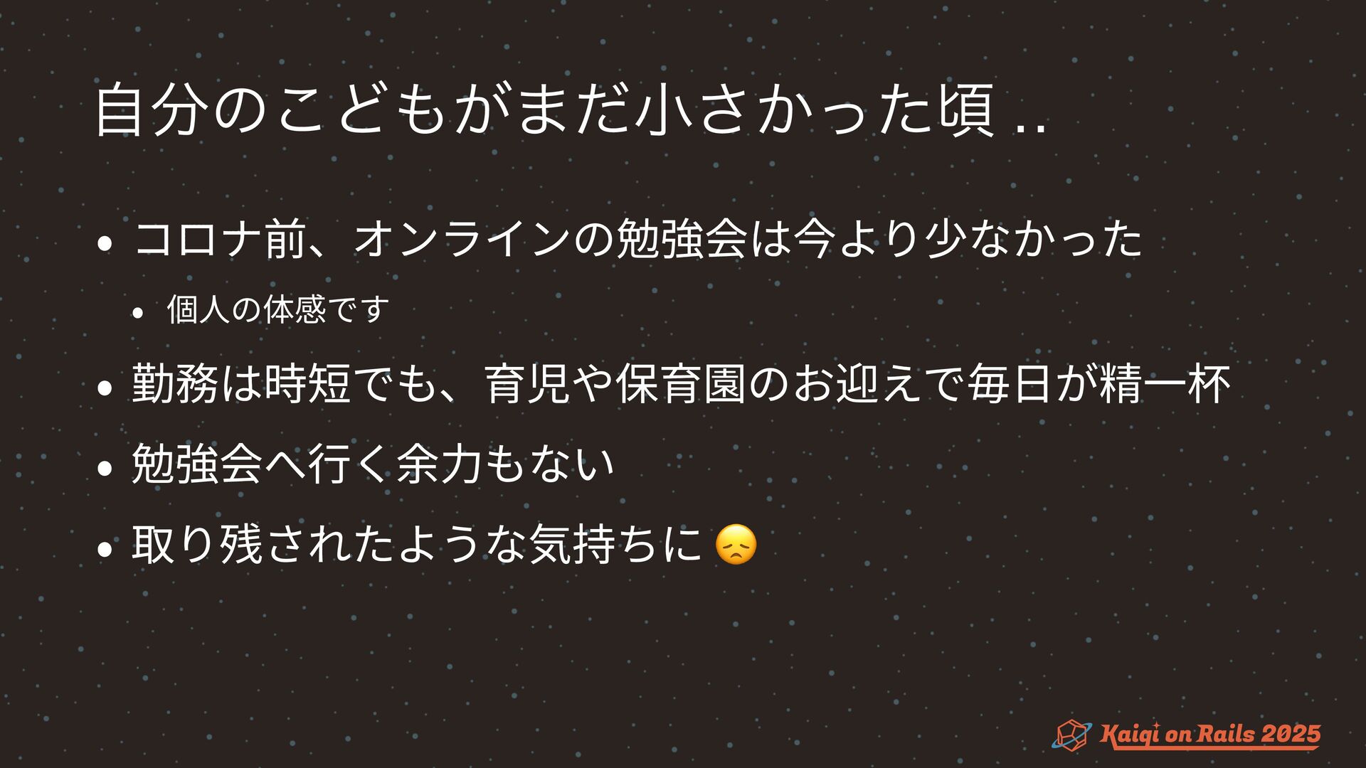 ࣗͷ͜Ͳ͕·ͩখ͔ͬͨ͞ࠒ ‥ • コロナ前、オンラインの勉強会は今より少なかった • 個 人 の体感です • 勤務は時短でも、育児や保育園のお迎えで毎