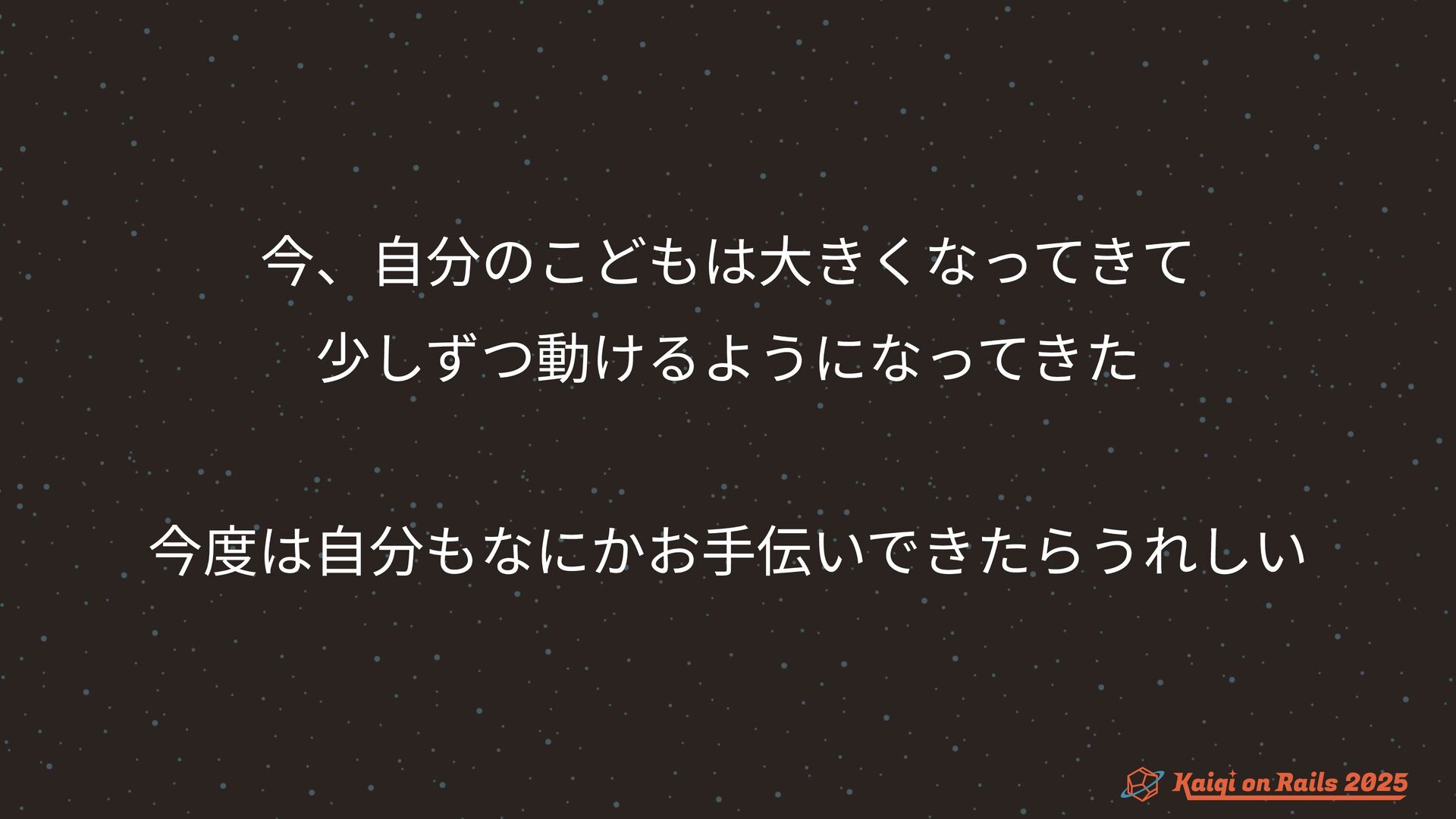 Kaigi on Rails, TokyoGirls.rb, RubyKaigi … • 託児チームに参加させてもらうことに • 託児チームは3名体制 • 全員お 子 さんがいる 👦