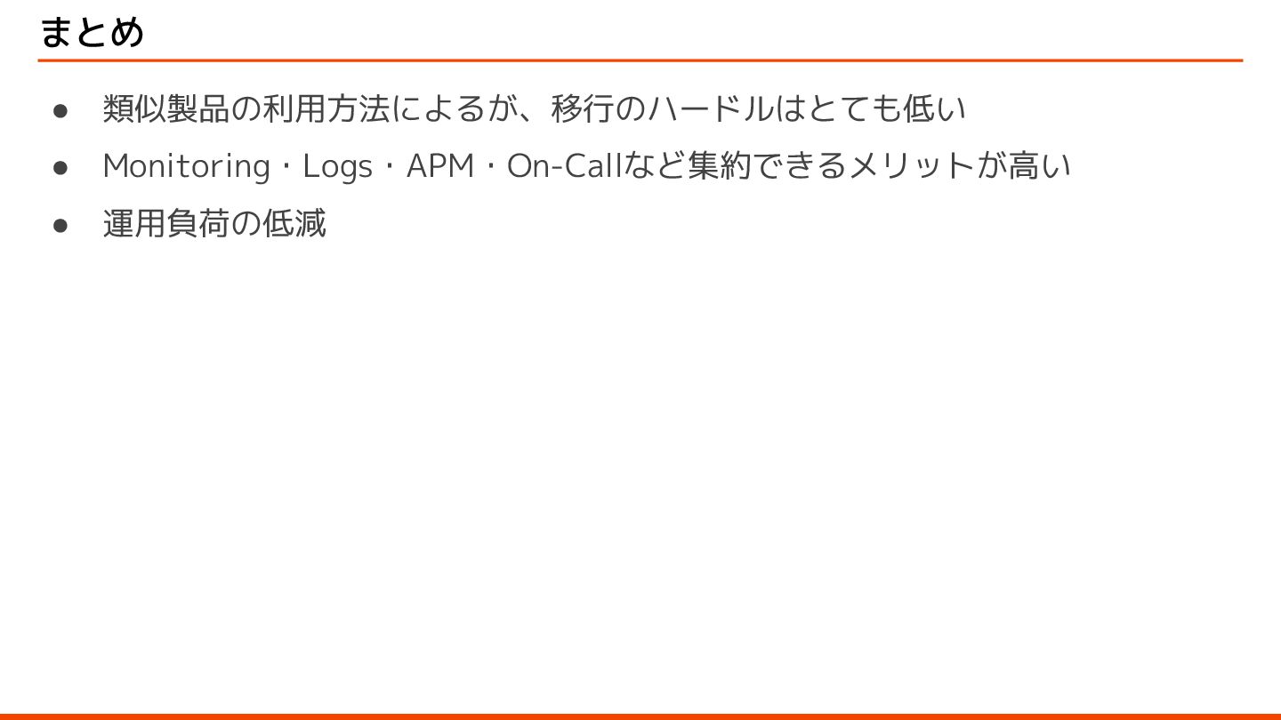 まとめ • 類似製品の利用方法によるが、移行のハードルはとても低い • Monitoring・Logs・APM・On-Callなど集約できるメリットが高い • 運用負荷の低減