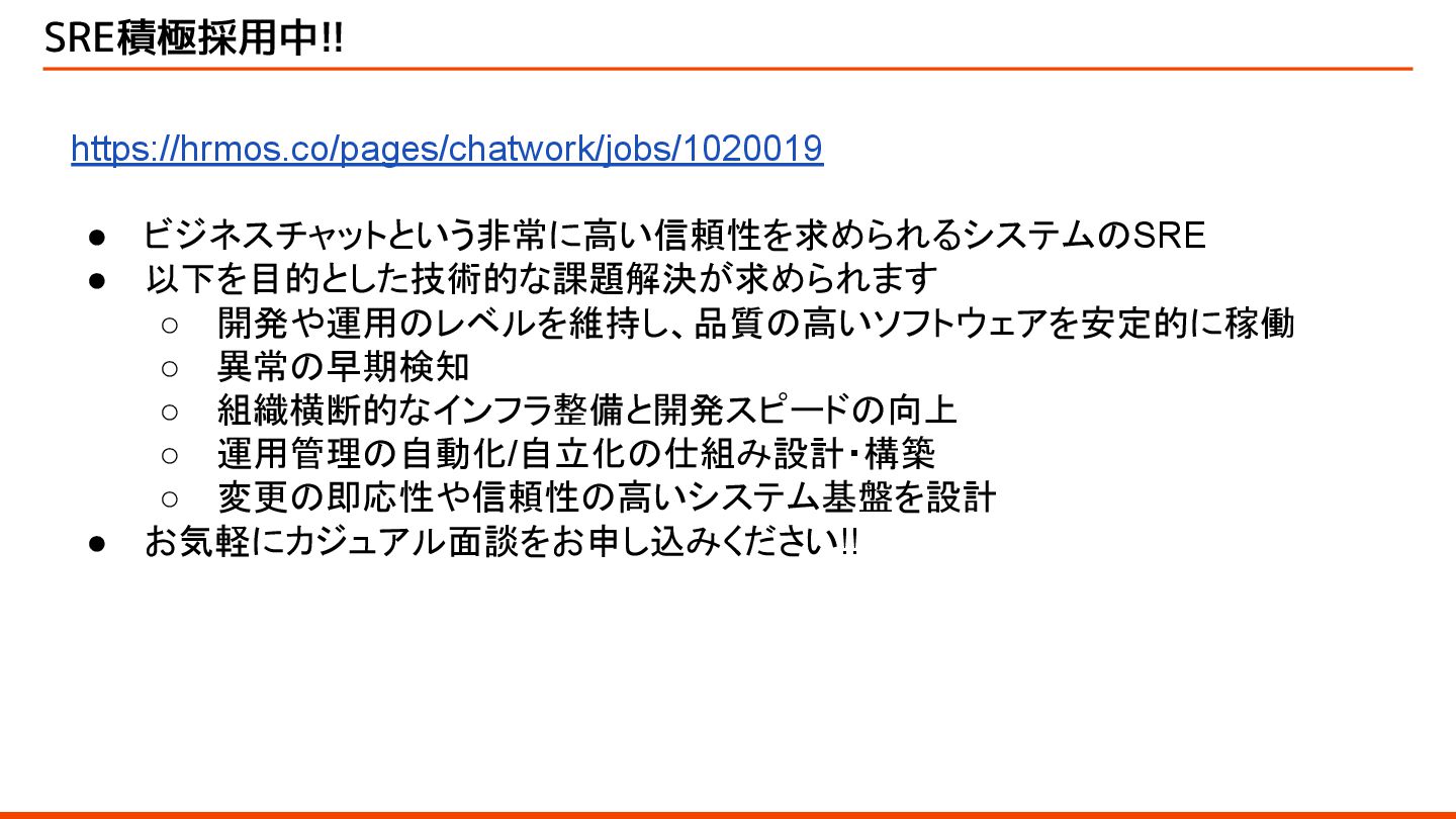 SRE積極採用中!! https://hrmos.co/pages/chatwork/jobs/1020019 • ビジネスチャットという非常に高い信頼性を求められるシステムのSRE • 以下を目的とした技術的な課題解決が求められます ◦ 開発や運用のレベルを維持し、品質の高いソフトウェアを安定的に稼働 ◦ 異常の早期検知