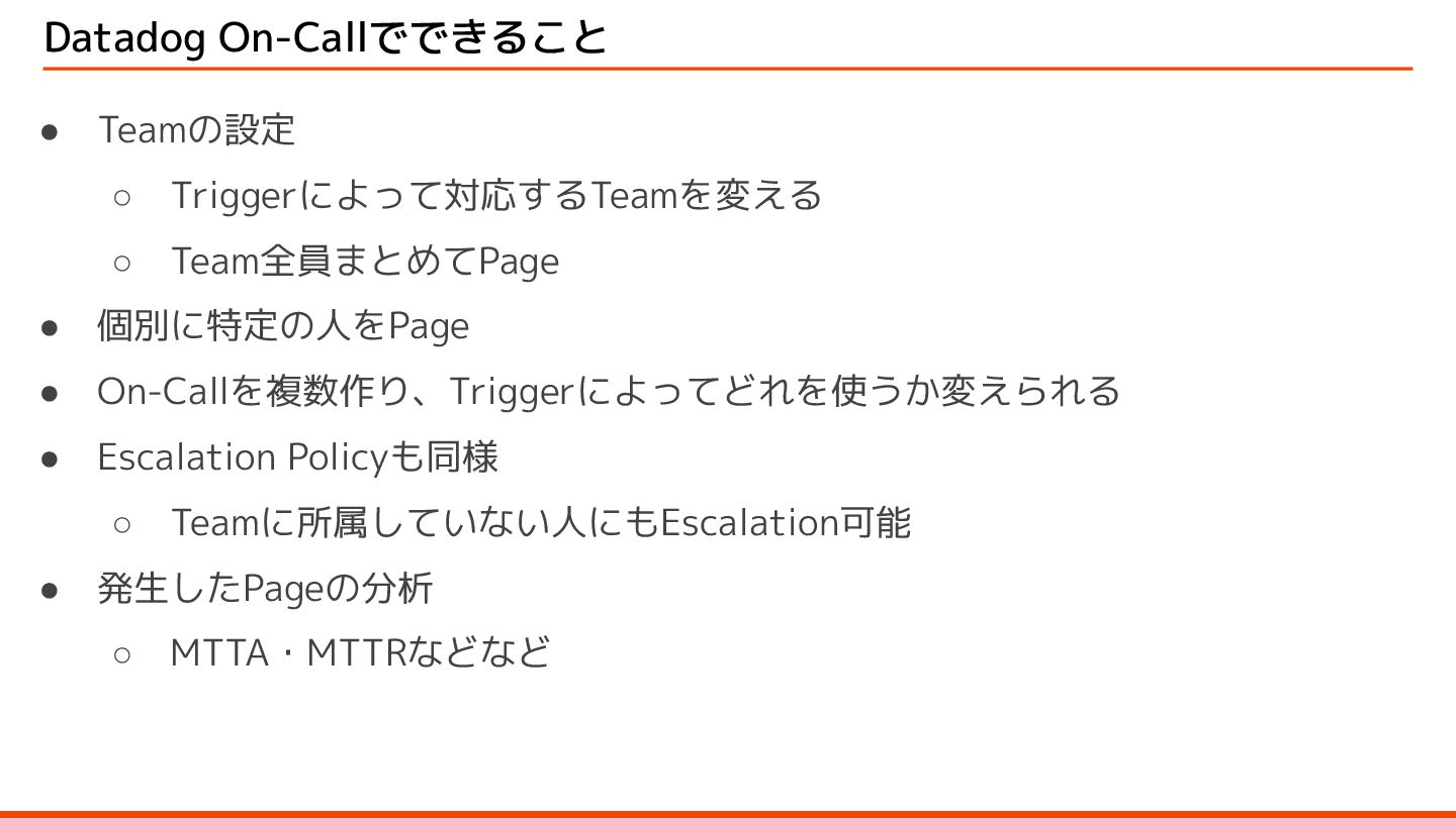 • On-Callを複数作り、Triggerによってどれを使うか変えられる • Escalation Policyも同様 ◦ Teamに所属していない人にもEscalation可能 • 発生したPageの分析 ◦ MTTA・MTTRなどなど