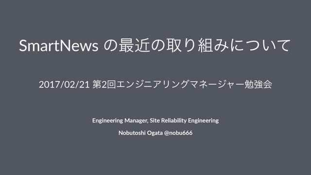 SmartNews ͷ࠷ۙͷऔΓΈʹ͍ͭͯ ɹ 2017/02/21 ୈ2ճΤϯδχΞϦϯάϚωʔδϟʔษڧձ ɹ Engineering Manager, Site Reliability