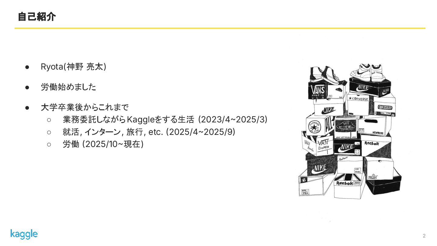 大学卒業後からこれまで ◦ 業務委託しながらKaggleをする生活 2023/42025/3 ◦ 就活, インターン, 旅行, etc. 2025/42025/9 ◦ 労働 2025/10現在) 2 自己紹介