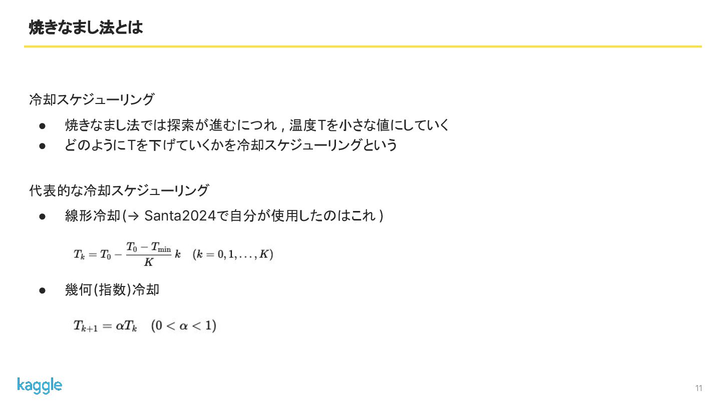 Kaggle Winner Presentation Template 11 焼きなまし法とは 冷却スケジューリング • 焼きなまし法では探索が進むにつれ ,