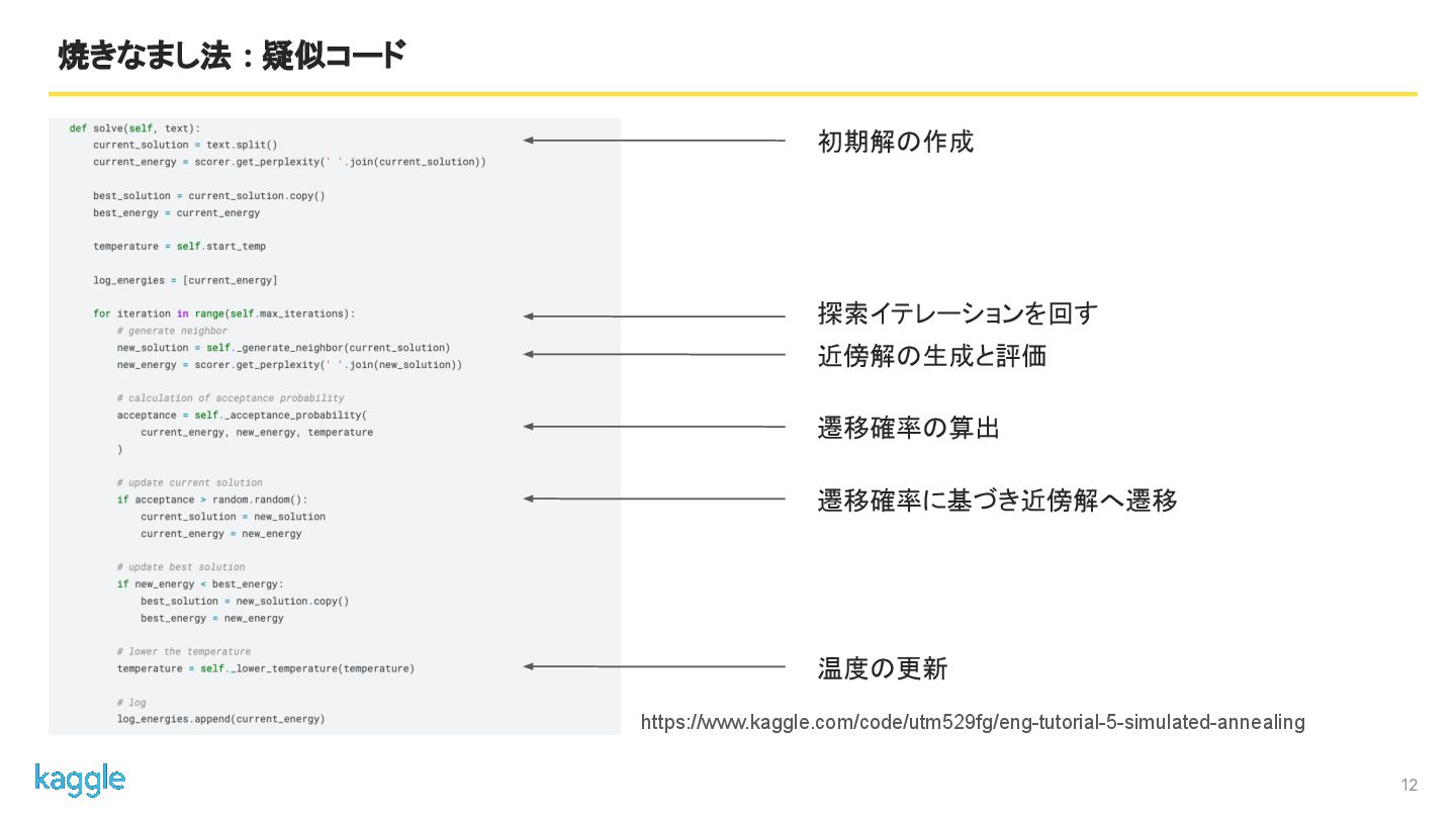 Kaggle Winner Presentation Template 12 焼きなまし法 : 疑似コード https://www.kaggle.com/code/utm529fg/eng-tutorial-5-simulated-annealing 初期解の作成