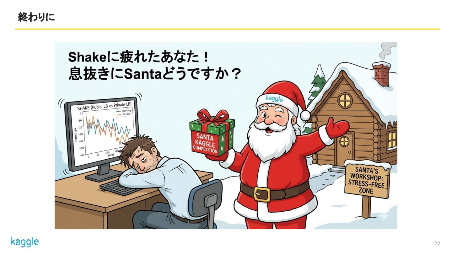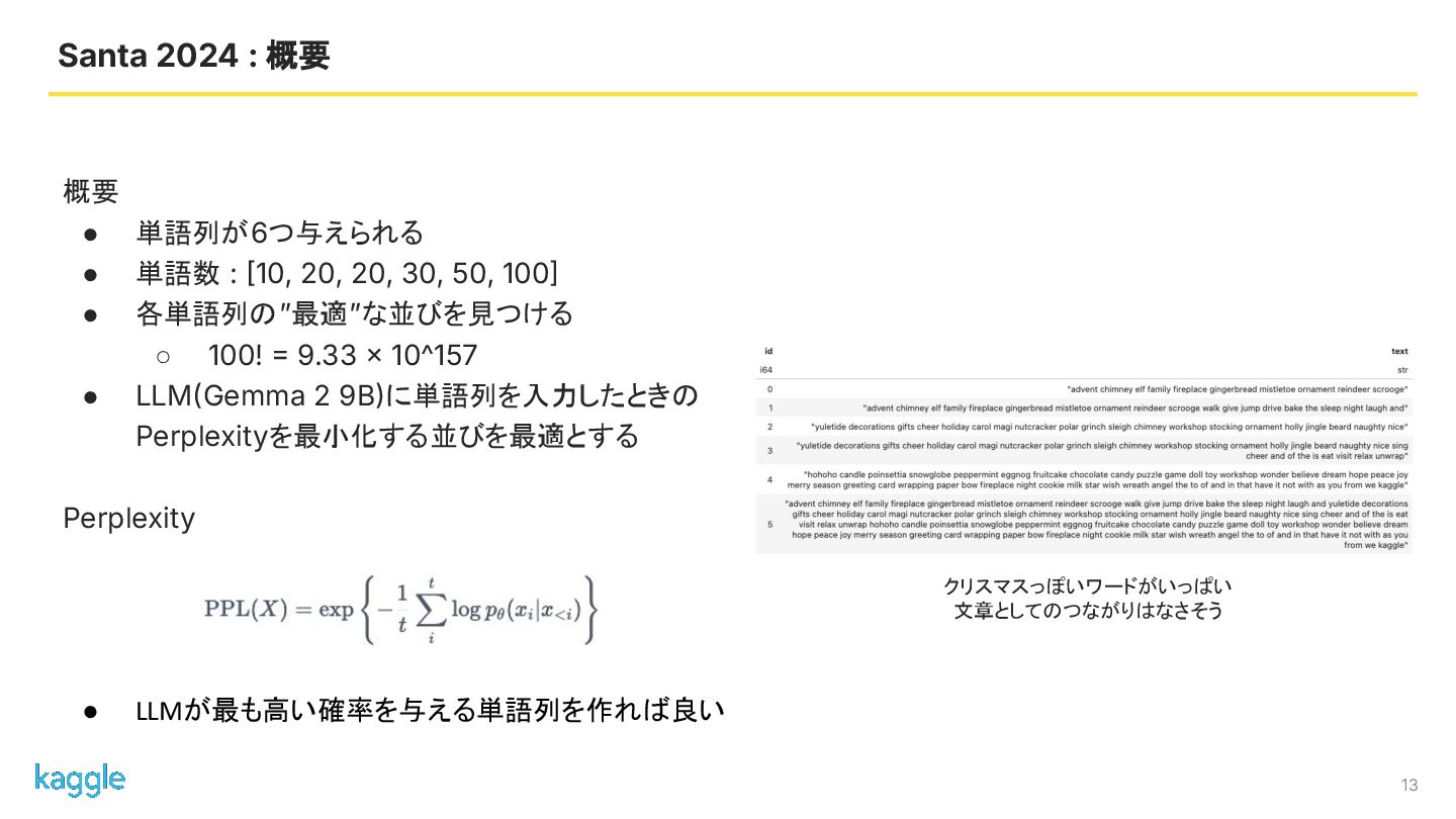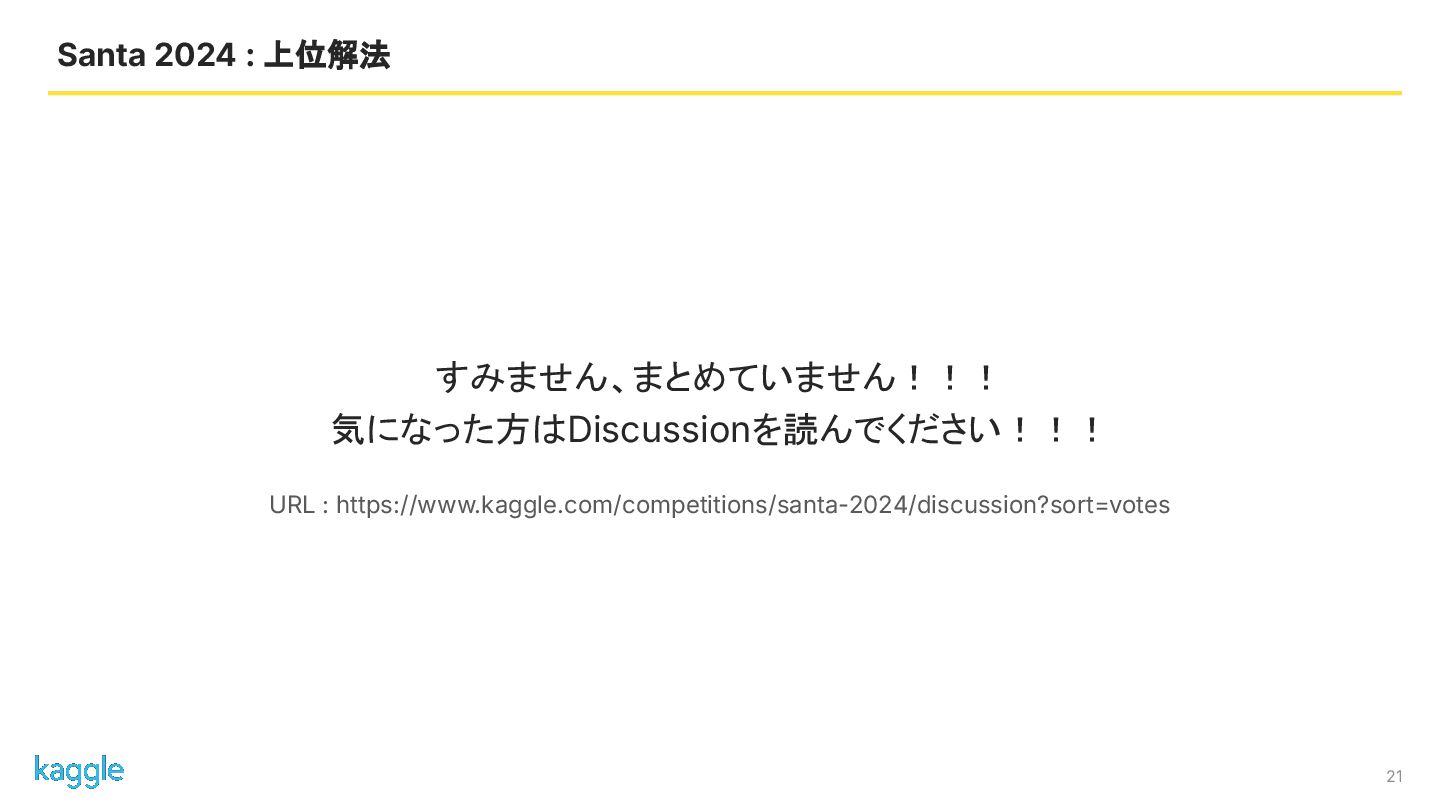 Kaggle Winner Presentation Template すみません、まとめていません!!! 気になった方はDiscussionを読んでください!!! 21 Santa 2024 :