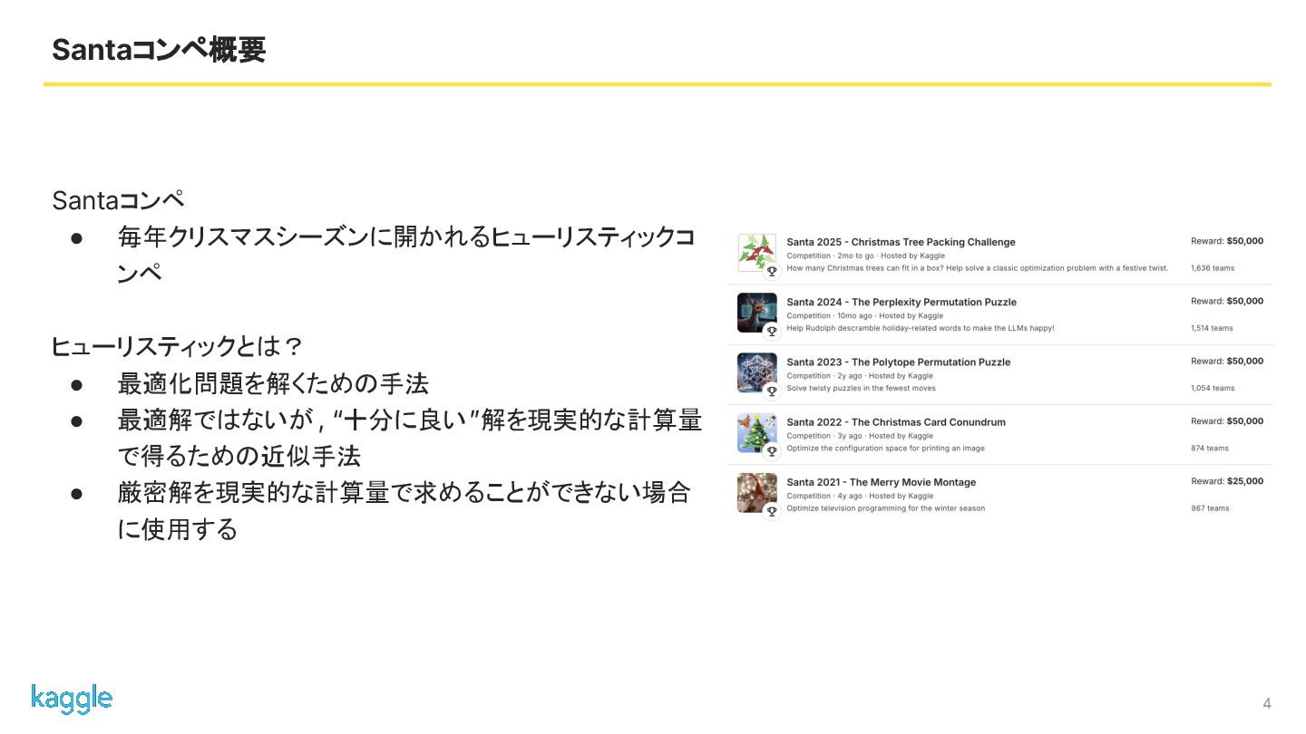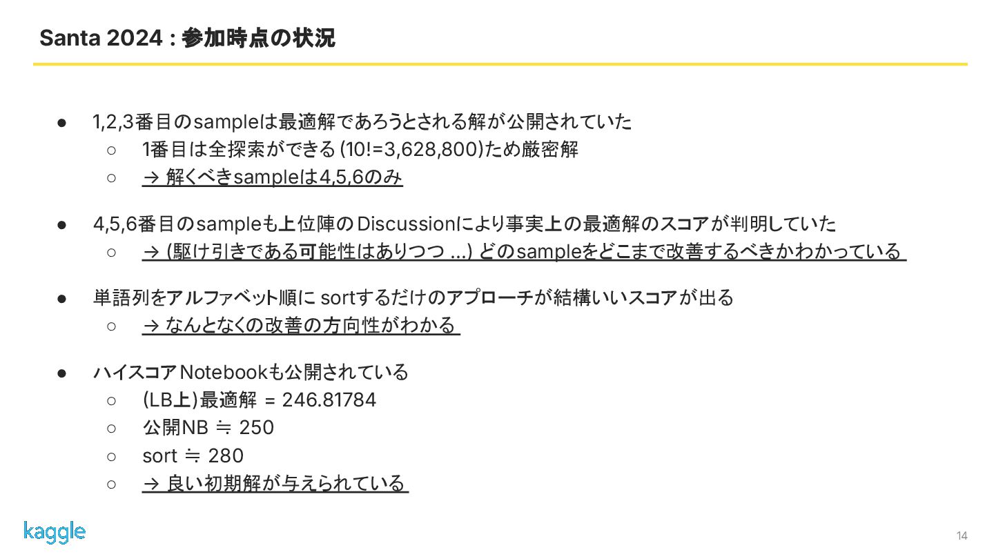 Kaggle Winner Presentation Template 14 Santa 2024 : 参加時点の状況 •