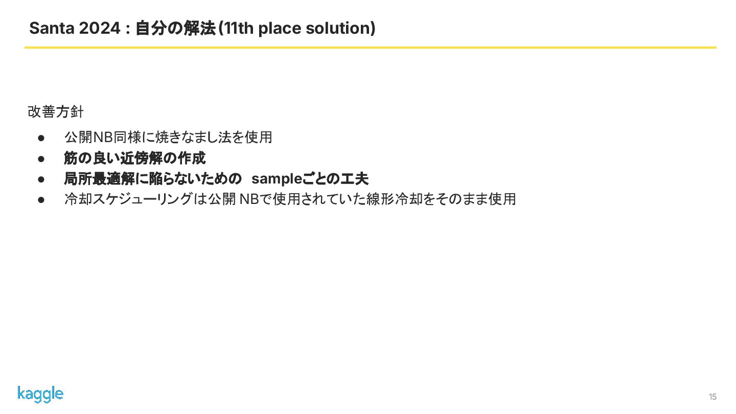 Kaggle Winner Presentation Template • 焼きなまし法 + その派生手法しか知りません • 焼きなまし法が使える年限定の