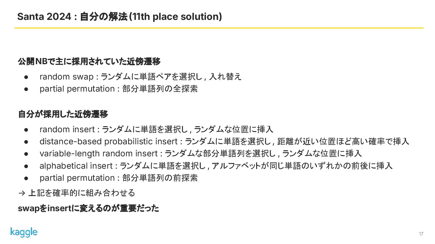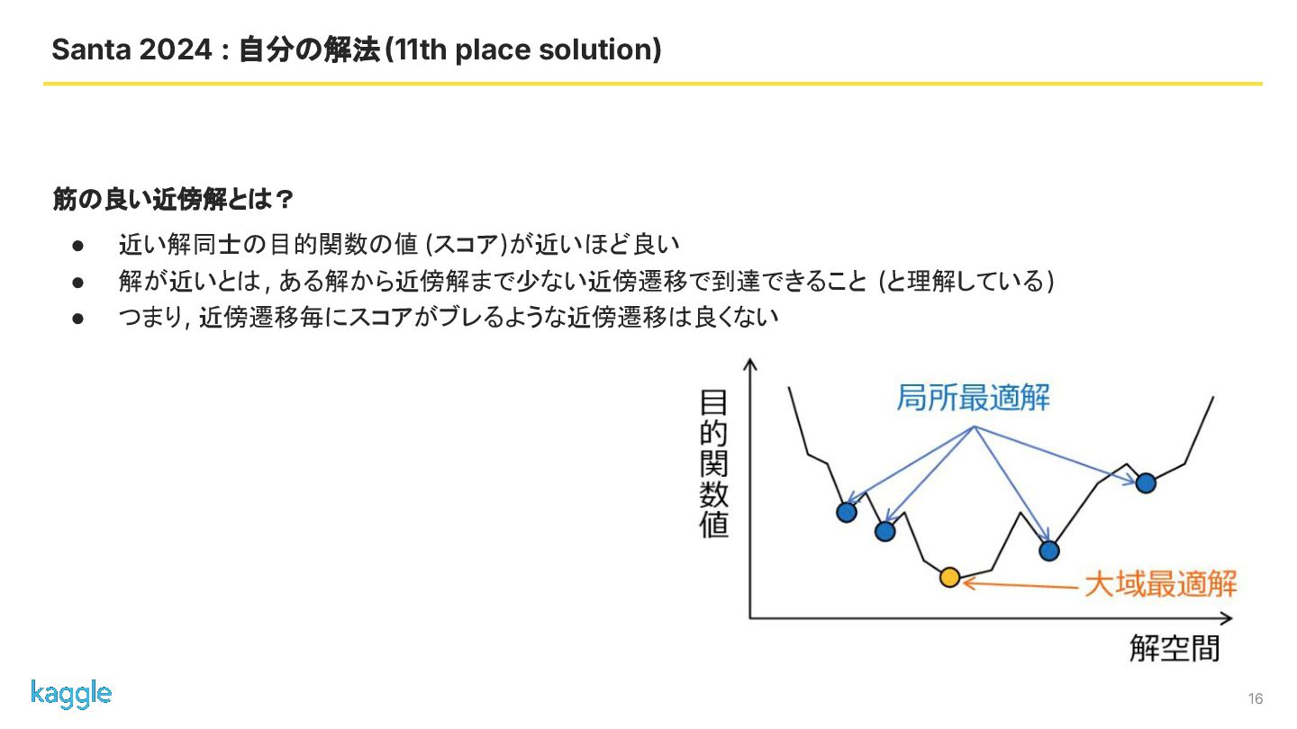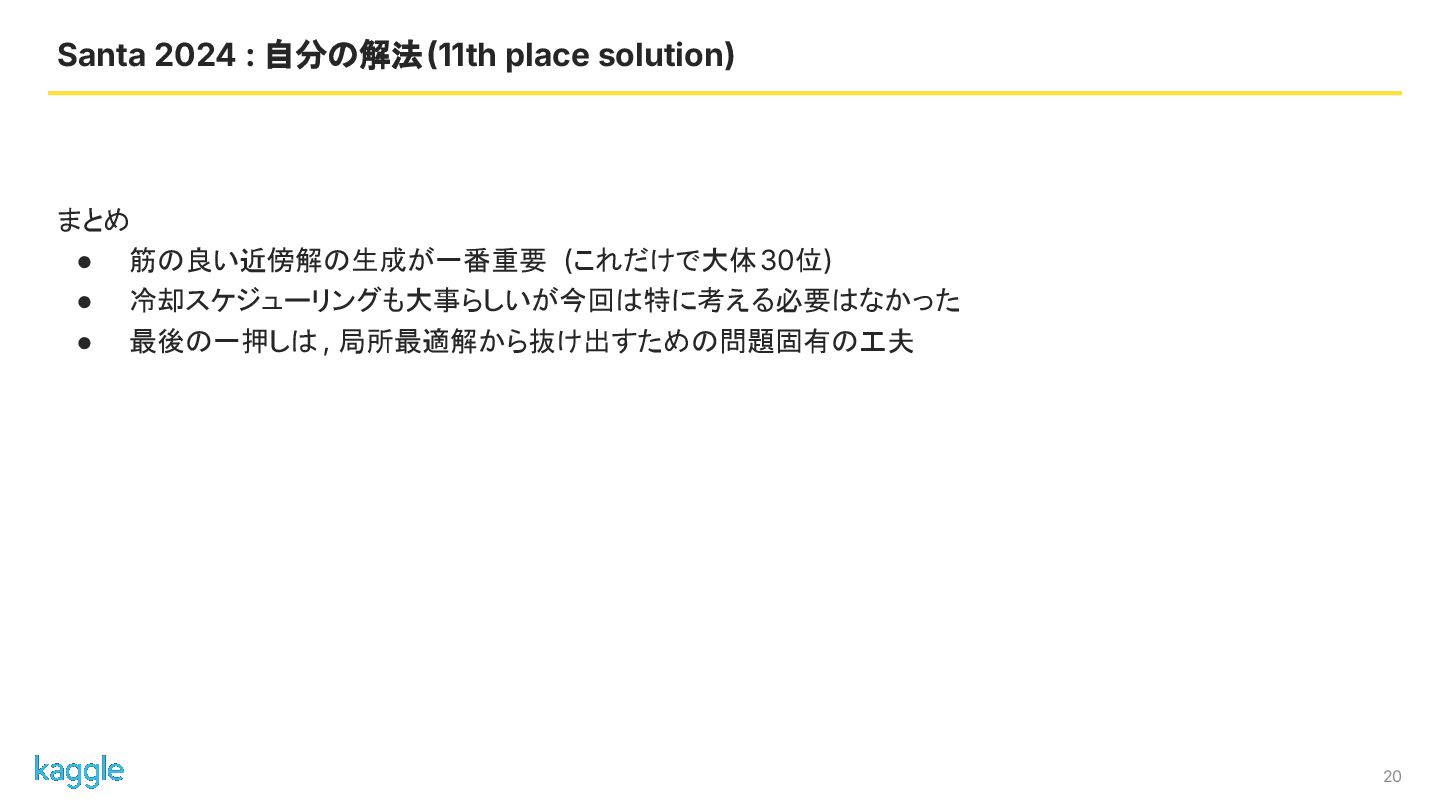• 最後の一押しは, 局所最適解から抜け出すための問題固有の工夫 20 Santa 2024 : 自分の解法11th place solution)