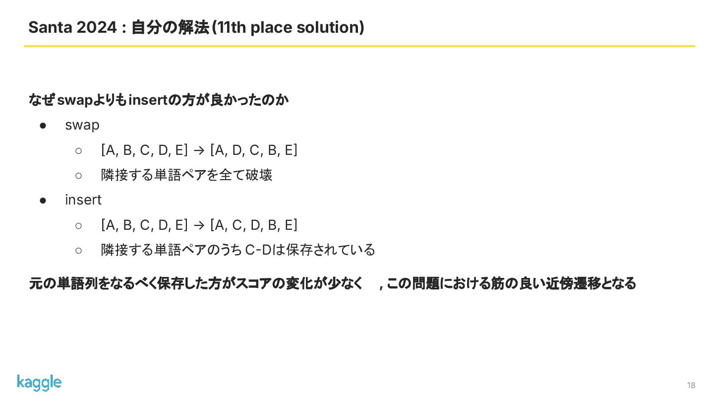 , 入れ替え • partial permutation : 部分単語列の全探索 17 Santa 2024 : 自分の解法11th place solution) 自分が採用した近傍遷移 • random insert : ランダムに単語を選択し , ランダムな位置に挿入 • distance-based probabilistic insert : ランダムに単語を選択し , 距離が近い位置ほど高い確率で挿入 • variable-length random insert : ランダムな部分単語列を選択し , ランダムな位置に挿入 • alphabetical insert : ランダムに単語を選択し , アルファベットが同じ単語のいずれかの前後に挿入 • partial permutation : 部分単語列の前探索 → 上記を確率的に組み合わせる swapをinsertに変えるのが重要だった