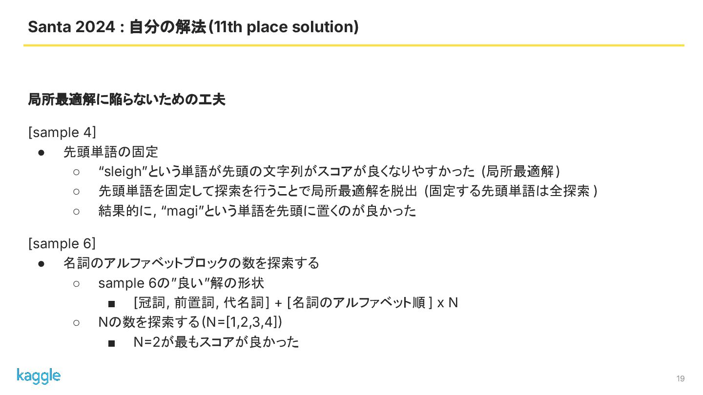 Kaggle Winner Presentation Template 局所最適解に陥らないための工夫 [sample 4 • 先頭単語の固定 ◦