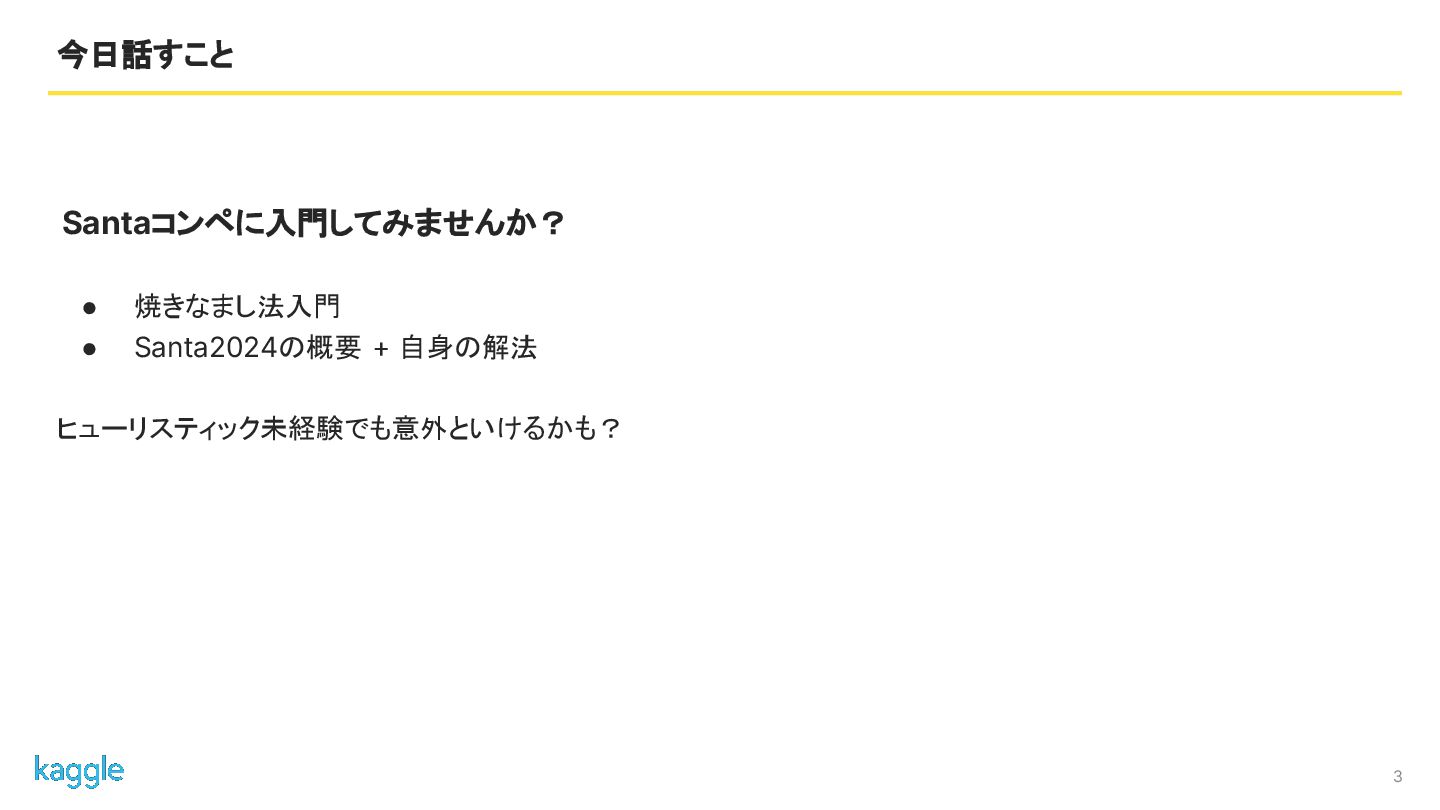 Kaggle Winner Presentation Template Santaコンペに入門してみませんか? • 焼きなまし法入門 • Santa2024の概要 +