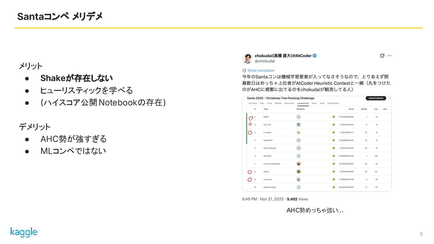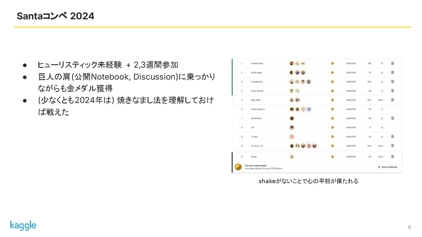 (ハイスコア公開Notebookの存在) デメリット • AHC勢が強すぎる • MLコンペではない 5 Santaコンペ メリデメ AHC勢めっちゃ強い...