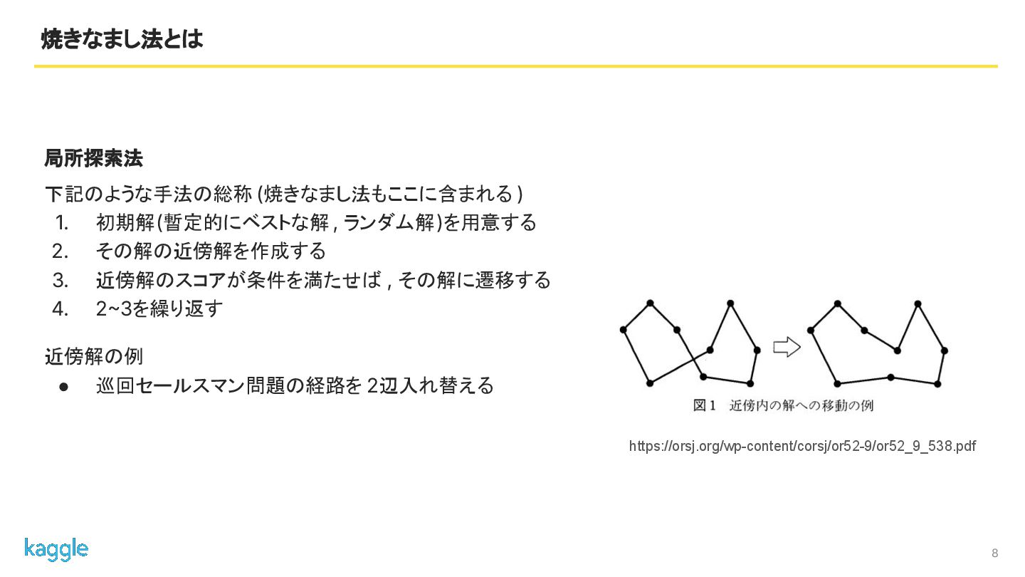 Kaggle Winner Presentation Template 局所探索法 下記のような手法の総称 (焼きなまし法もここに含まれる ) 1. 初期解(暫定的にベストな解