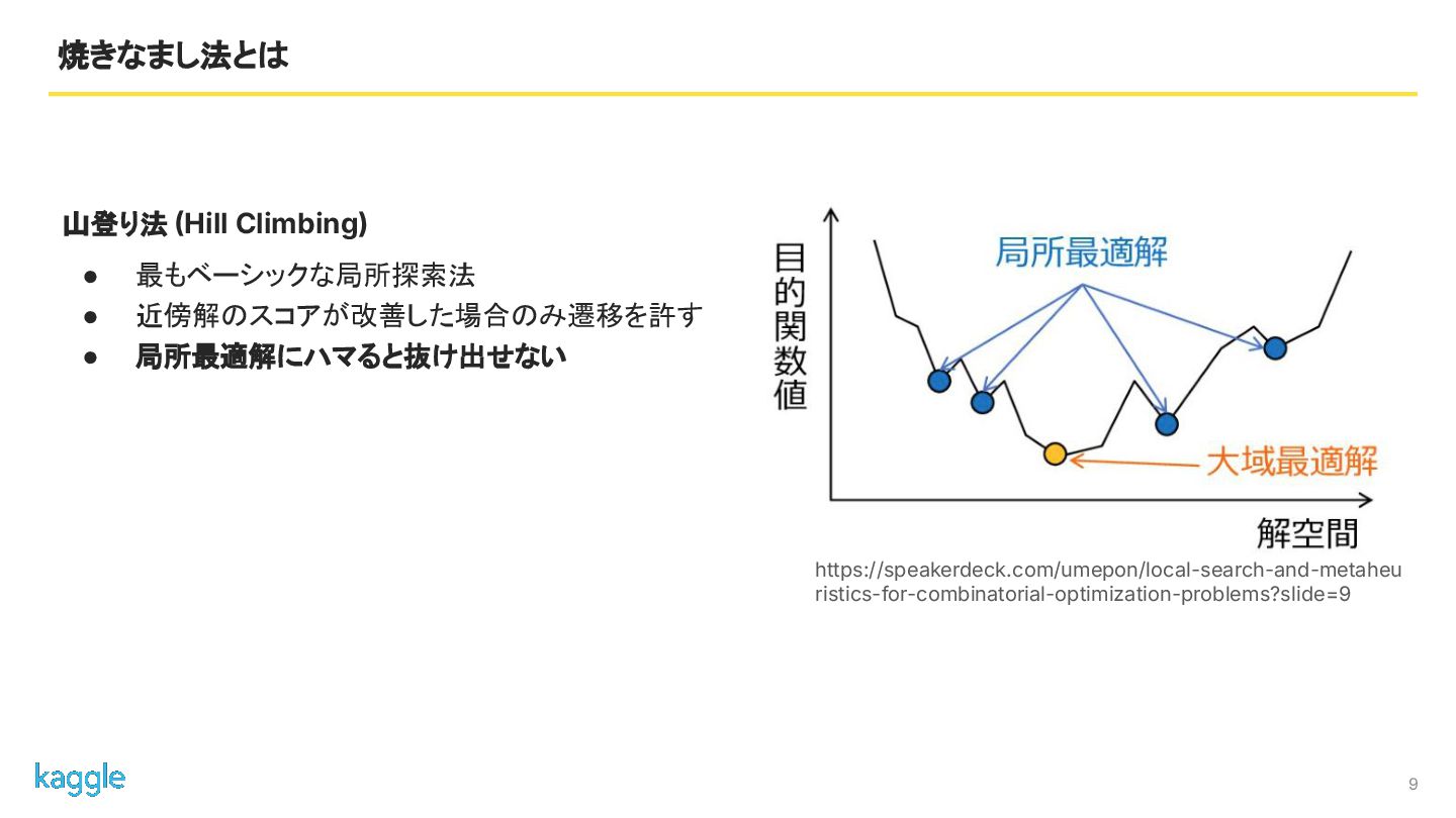Kaggle Winner Presentation Template 山登り法 Hill Climbing) • 最もベーシックな局所探索法 •
