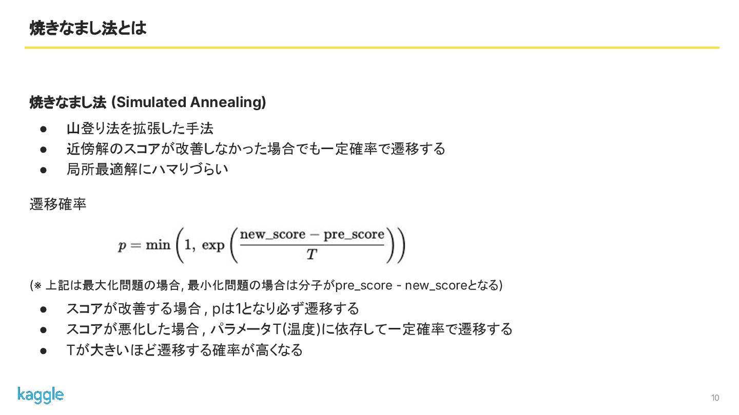 近傍解のスコアが改善した場合のみ遷移を許す • 局所最適解にハマると抜け出せない 9 焼きなまし法とは https://speakerdeck.com/umepon/local-search-and-metaheu ristics-for-combinatorial-optimization-problems?slide=9