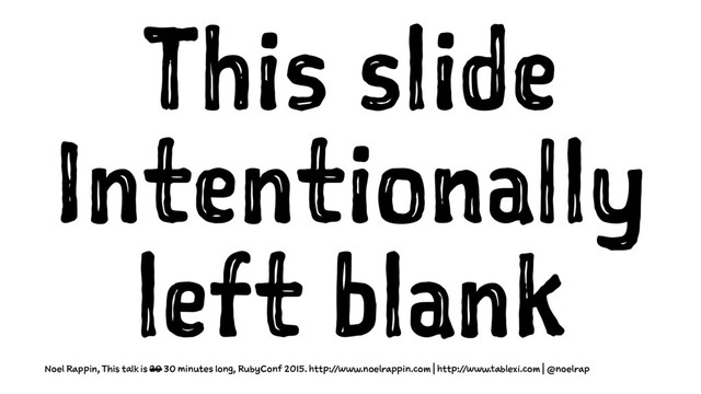 And it's not rush hour And I don't blow a tire Noel Rappin, This talk is 20 30 minutes long, RubyConf 2015. http://www.noelrappin.com | http://www.tablexi.com | @noelrap