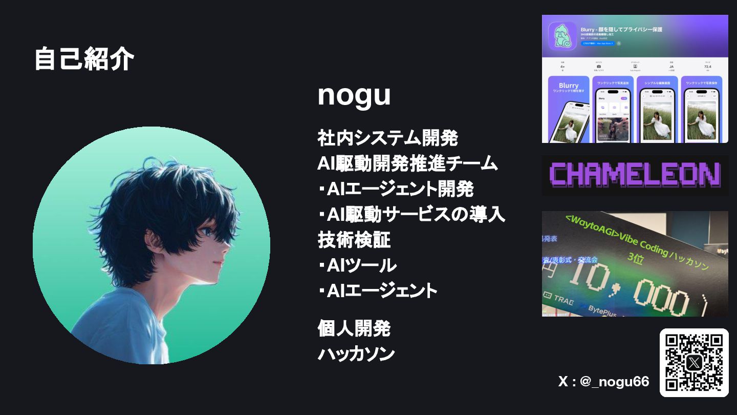 自己紹介 社内システム開発 AI駆動開発推進チーム ・AIエージェント開発 ・AI駆動サービスの導入 技術検証 ・AIツール ・AIエージェント 個人開発 ハッカソン