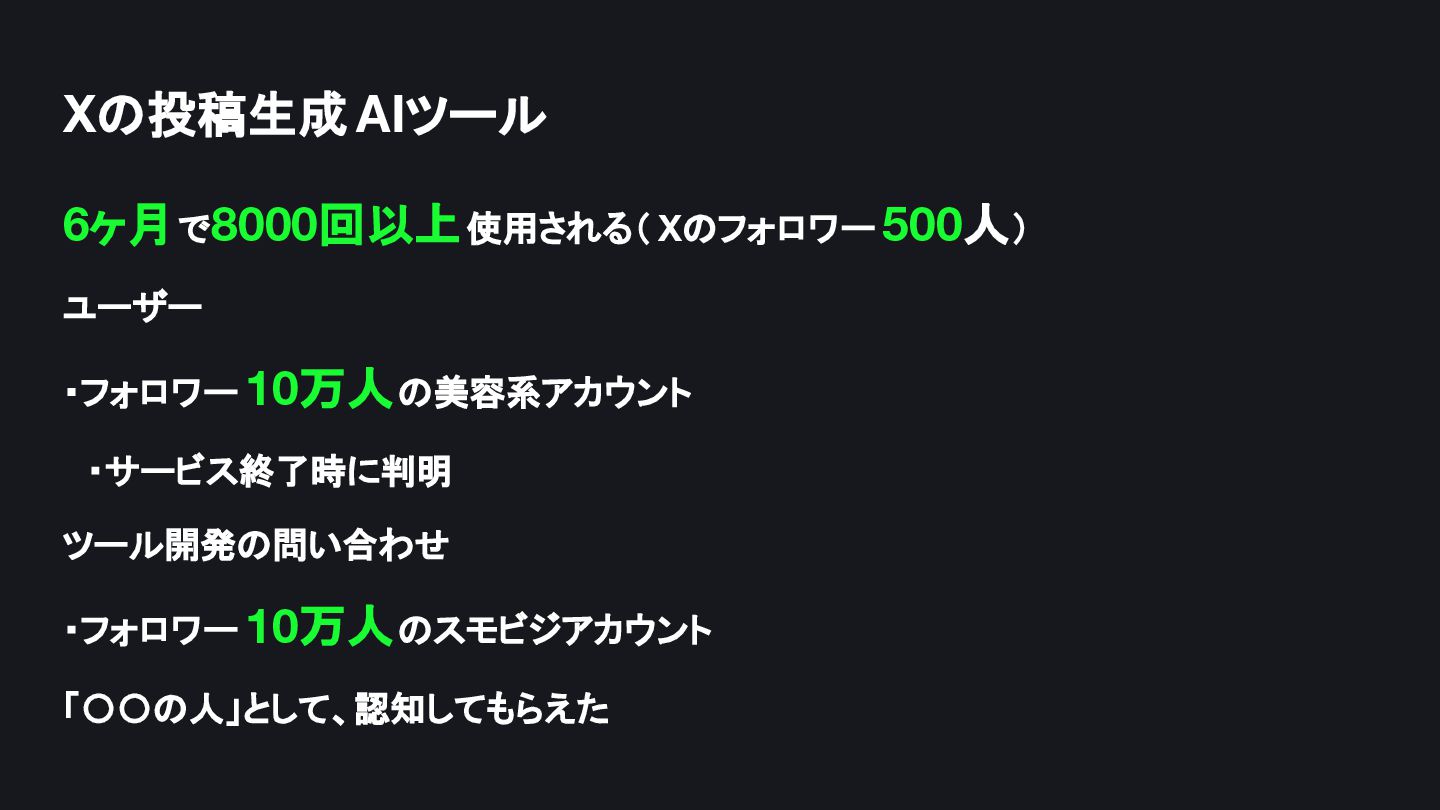 Xの投稿生成 AIツール 6ヶ月で8000回以上使用される( Xのフォロワー 500人) ユーザー ・フォロワー 10万人の美容系アカウント ・サービス終了時に判明 ツール開発の問い合わせ