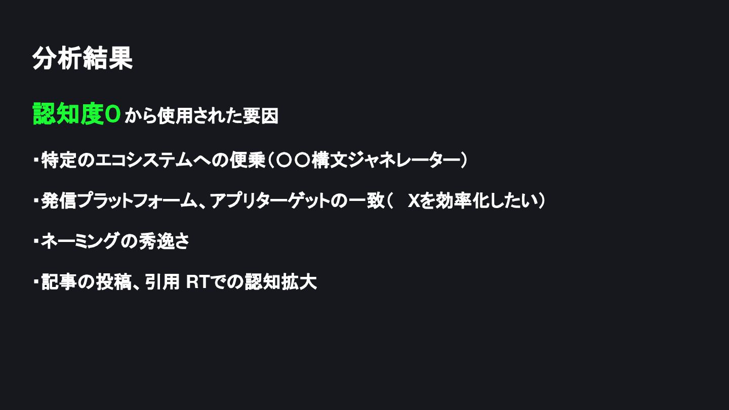 分析結果 認知度0から使用された要因 ・特定のエコシステムへの便乗(〇〇構文ジャネレーター) ・発信プラットフォーム、アプリターゲットの一致( Xを効率化したい) ・ネーミングの秀逸さ ・記事の投稿、引用 RTでの認知拡大