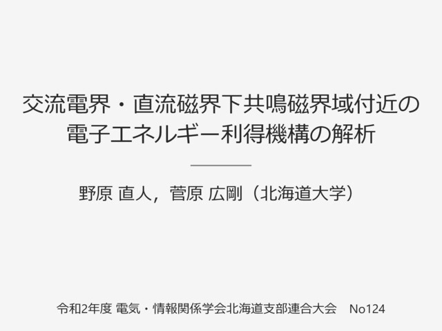 交流電界・直流磁界下共鳴磁界域付近の 電⼦エネルギー利得機構の解析 野原 直⼈,菅原 広剛(北海道⼤学) 令和2年度 電気・情報関係学会北海道⽀部連合⼤会 No124