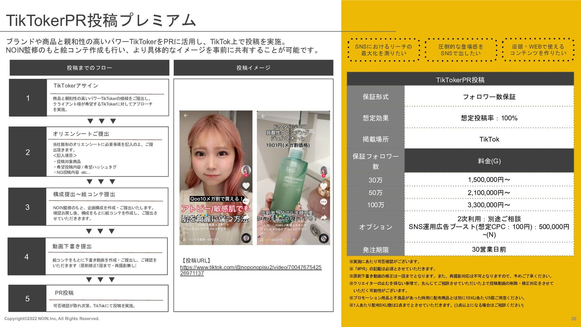 想定投稿率:50〜70% 想定フォロワー数:3,000~10,000フォロワー 掲載場所 TikTok 配布者数 料金(G) 10人 500,000円 15人 600,000円 20人 700,000円 30人 900,000円 40人 1,100,000円 50人 1,500,000円 オプション 2次利用(半年):300,000円(N) 2次利用(1年):400,000円(N) アンケート:4,000円(N) / 1件 SNS運用広告ブースト(想定CPC:100円):500,000円~(N) 発注期限 30営業日前 TikTokerギフティング ブランドや商品と親和性の高いTikTokerをPRに活用し、熱量のある口コミをTikTokへ拡散。 今まで画像での訴求が難しかった商品も短尺動画によって、訴求が可能に。 SNSにおけるリーチの 最大化を測りたい 圧倒的な登場感を SNSで出したい 店頭・WEBで使える コンテンツを作りたい ※実施にあたり可否確認がございます。 ※投稿率を100%保証ご希望の場合は、事務局運営費として上記記載の2倍の料金とさせていただきます。 ※投稿率を100%保証且つ、投稿前の事前確認をご希望の場合は事務局運営費として上記記載の2.5倍の料金とさせていただきます。 ※リクルーティングについてはどうしてもNGの方のみ変更可能です。 ※プロモーション用品と不良品があった時用に配布商品とは別に1SKUあたり5個ご用意ください。 ※1人あたり配布SKU数は2点までとさせていただきます。(3点以上になる場合はご相談ください) ※配布商品が複数ある場合は必ず「セット組」をしてから納品してください。 ※当社で「セット組」を行う場合別途費用が発生いたします。(1セットにつき50円〜) 投稿までのフロー 1 2 3 オリエンシートご提出 アプローチ&回収 口コミ投稿 当社雛形のオリエンシートに必要事項を記入の上、ご提 出いただききます。 <記入項目> ・配布商品 ・NGリスト(系統) ・対象の年齢層 ・希望投稿内容 / 希望ハッシュタグ etc... オリエンシートをもとに、NOINギフティングネットワ ークに加入しているTikTokerに募集をかけ、応募者 に対してギフティングを実施。 可否確認が取れ次第、TikTokにて投稿を実施。 投稿イメージ 【投稿URL】 https://www.tiktok.com/@xoxouhho/video/7021453370934 168833
