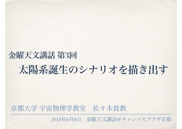 0:6, which means that the typical result- ing system consists of two Earth-sized planets and a smaller planet. In this model, we obtain hna i ’ 1:8 Æ 0:7. In other words, one or two planets tend to form outside the initial distribution of protoplanets. In most runs, these planets are smaller scattered planets. Thus we obtain a high efficiency of h fa i ¼ 0:79 Æ 0:15. The accretion timescale is hTacc i ¼ 1:05 Æ 0:58 ð Þ ; 108 yr. These results are consistent with Agnor et al. (1999), whose initial con- clus sam ha1 i larg are 0:06 hM2 0:05 Fig. 2.—Snapshots of the system on the a-e (left) and a-i (right) planes at t ¼ 0, 106, 10 are proportional to the physical sizes of the planets. KOKUBO, KOMINAM 1134 ͍࣌ؒΛ͔͚ͯݪ࢝ಉ࢜ͷيಓ͕ཚΕΔ ɹˠޓ͍ʹিಥɾ߹ମͯ͠ΑΓେ͖ͳఱମʹ <,PLVCP*EB > (c) Hidenori Genda