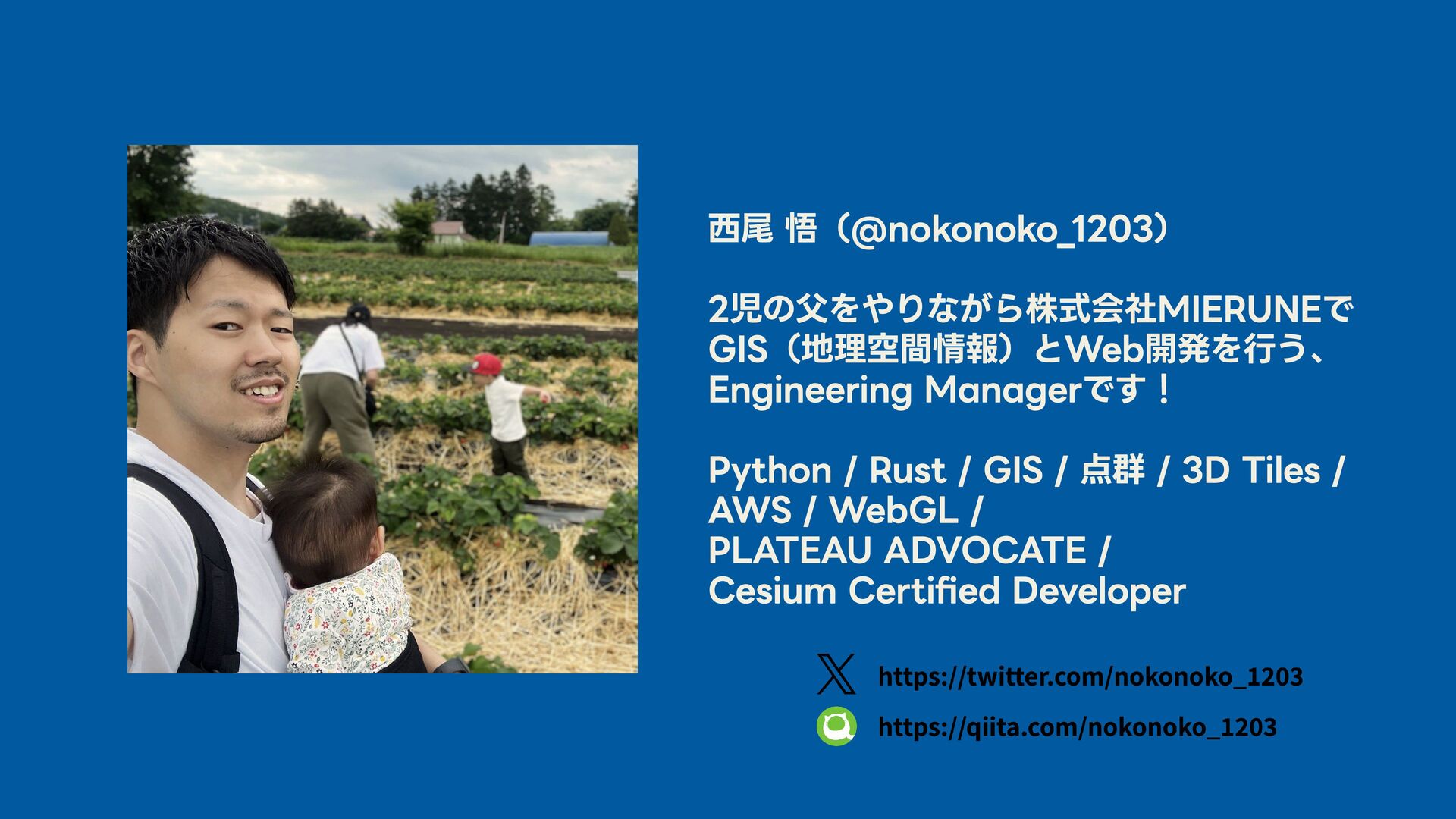 西尾 悟(@nokonoko_1203) 2児の父をやりながら株式会社MIERUNEで GIS(地理空間情報)とWeb開発を行う、 Engineering Managerです! Python / Rust /