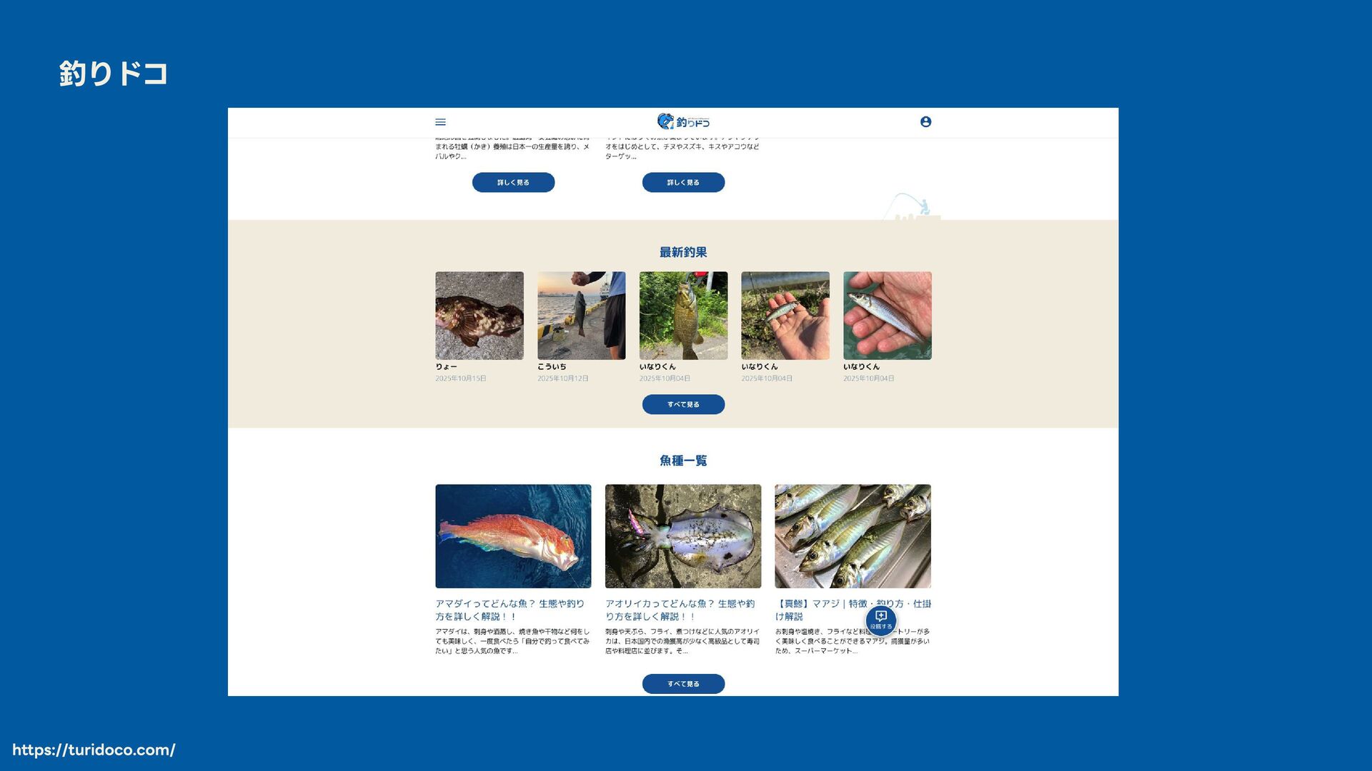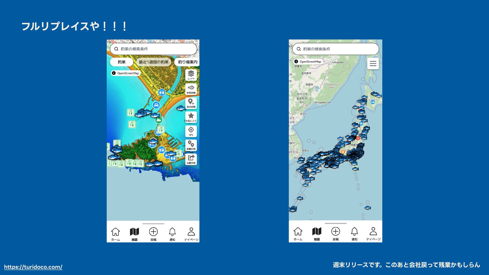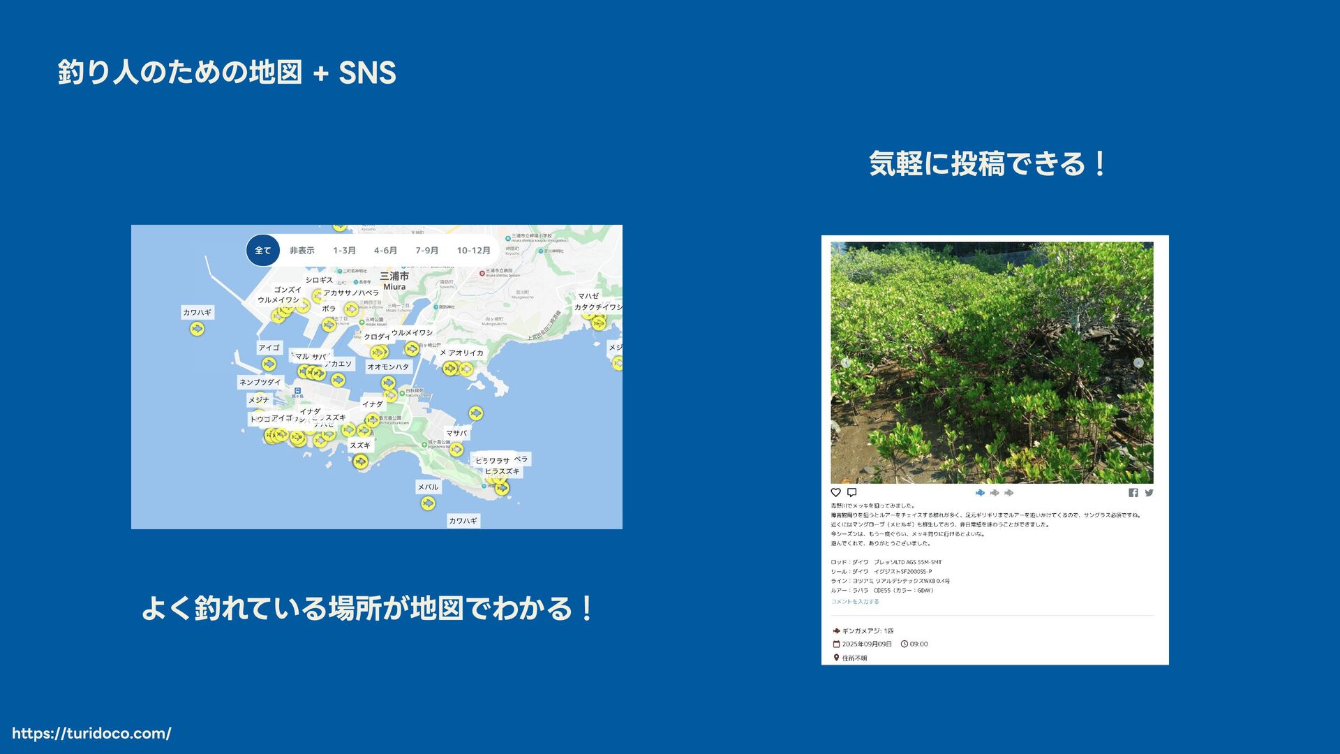 釣り人のための地図 + SNS https://turidoco.com/ よく釣れている場所が地図でわかる! 気軽に投稿できる!