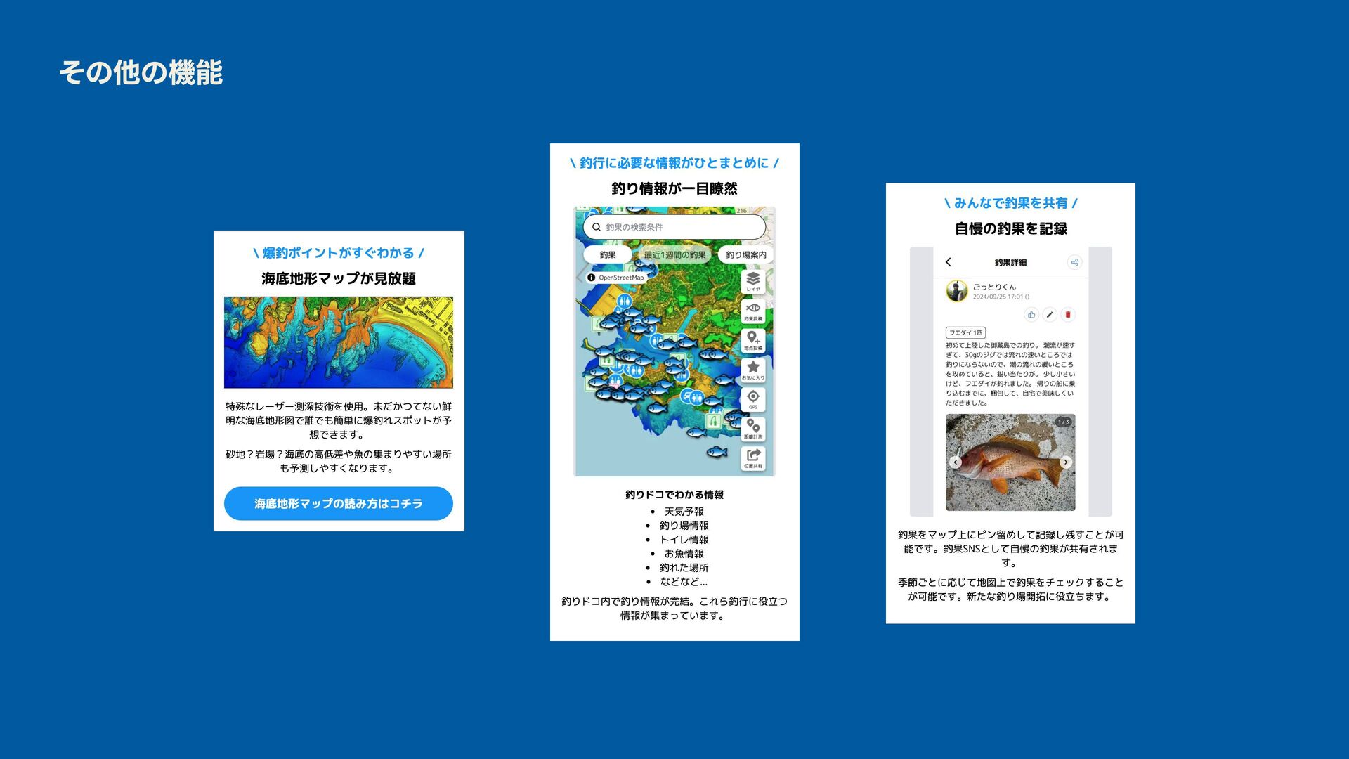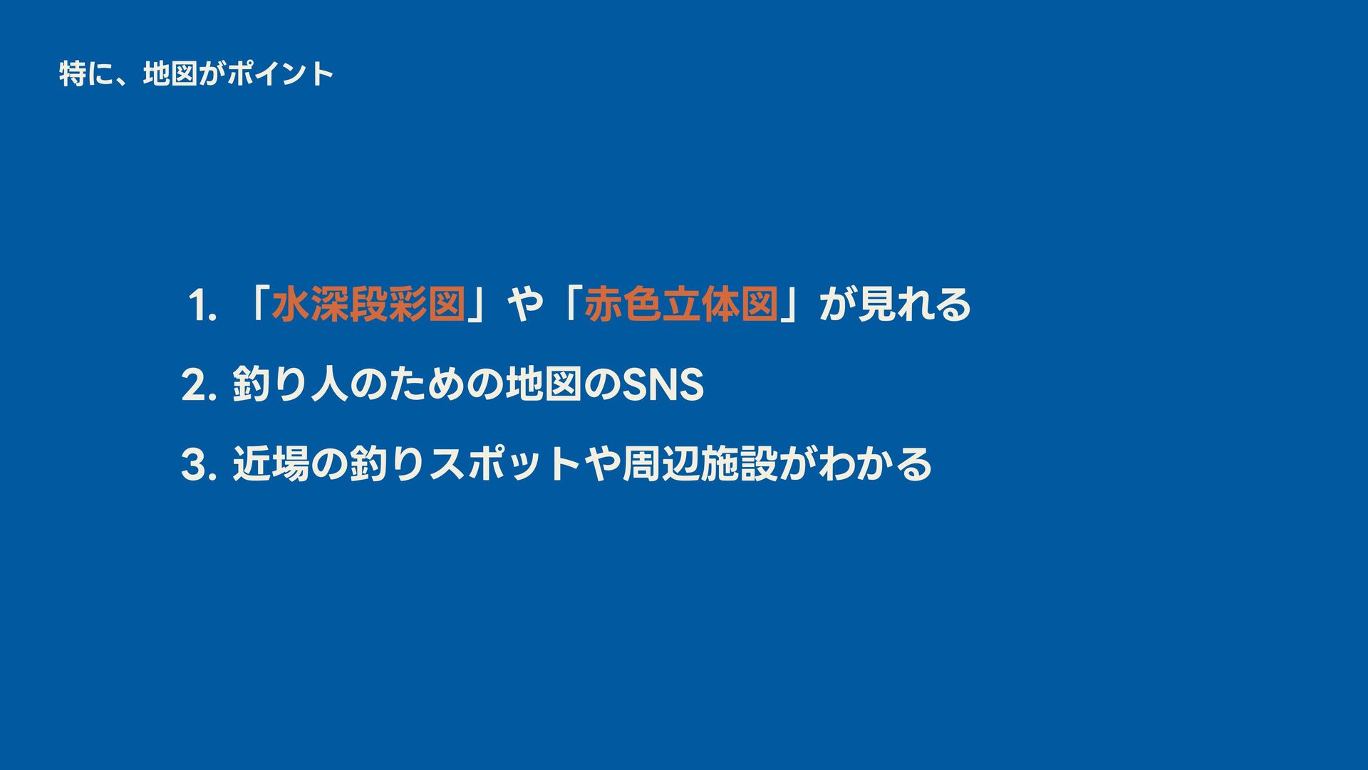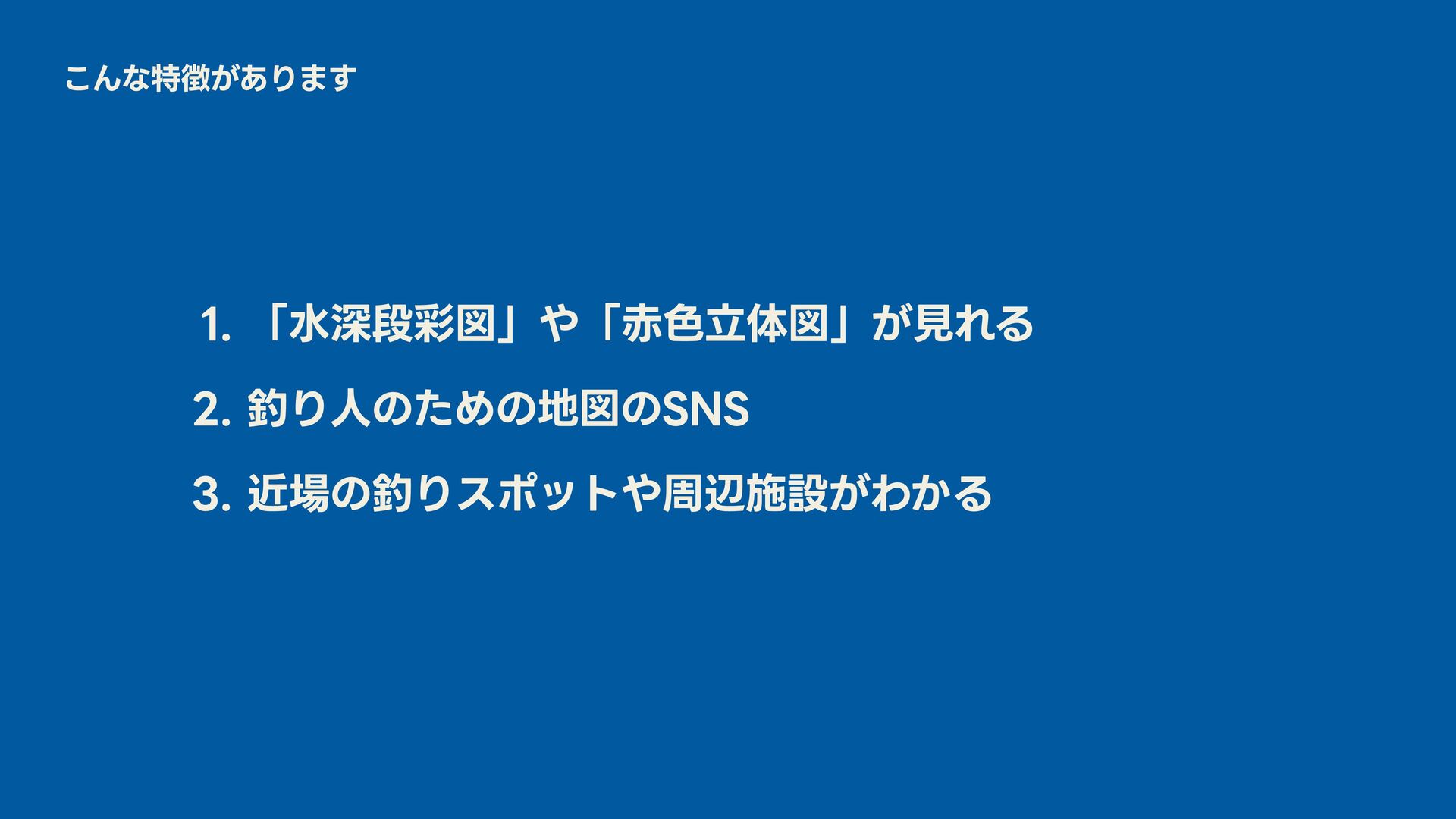 「水深段彩図」や「赤色立体図」が見れる 釣り人のための地図のSNS 近場の釣りスポットや周辺施設がわかる こんな特徴があります
