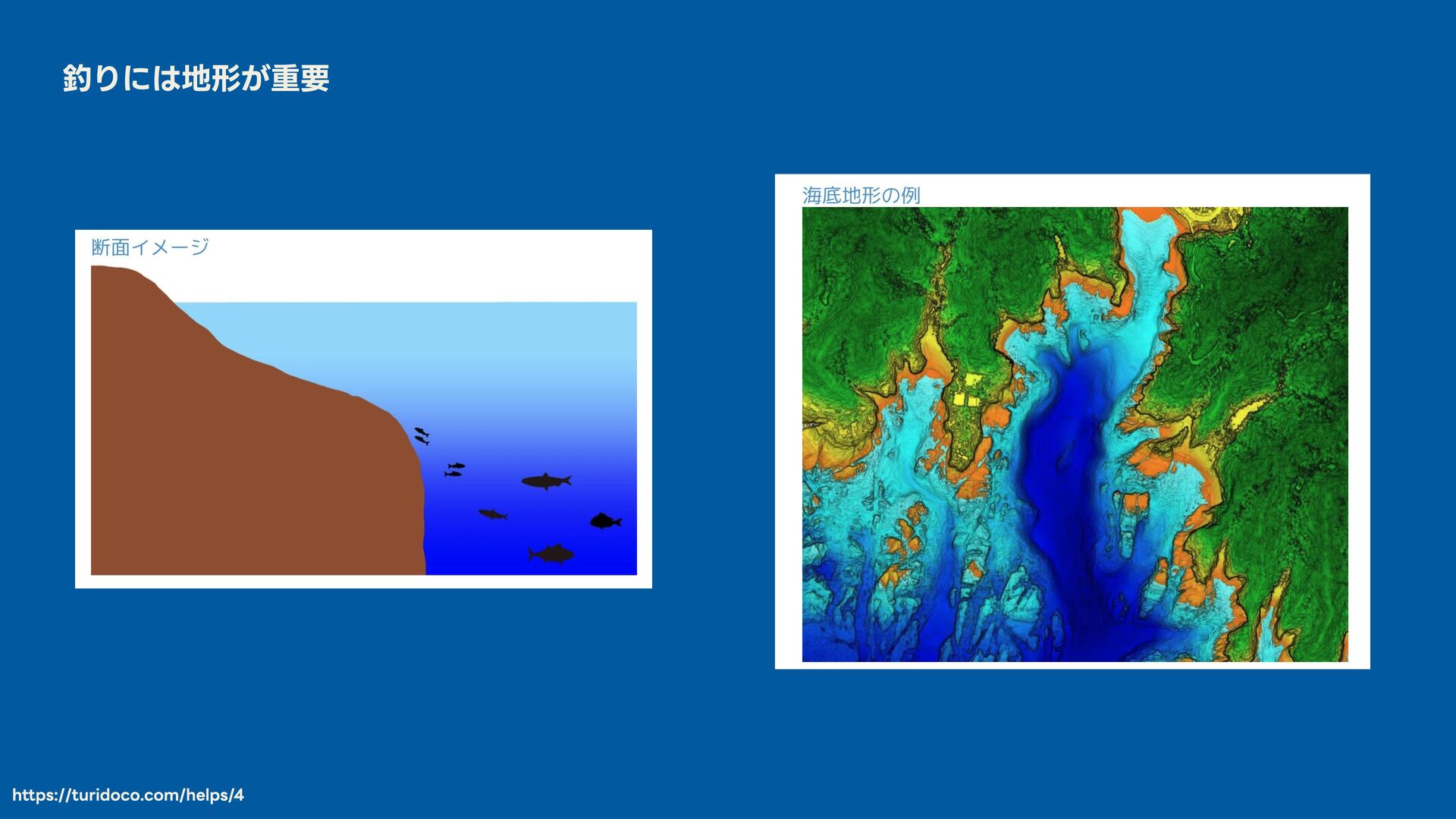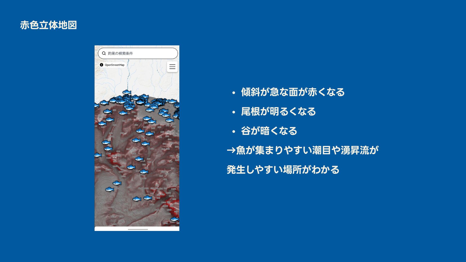 「 」や「 」が見れる 釣り人のための地図のSNS 近場の釣りスポットや周辺施設がわかる 水深段彩図 赤色立体図 特に、地図がポイント
