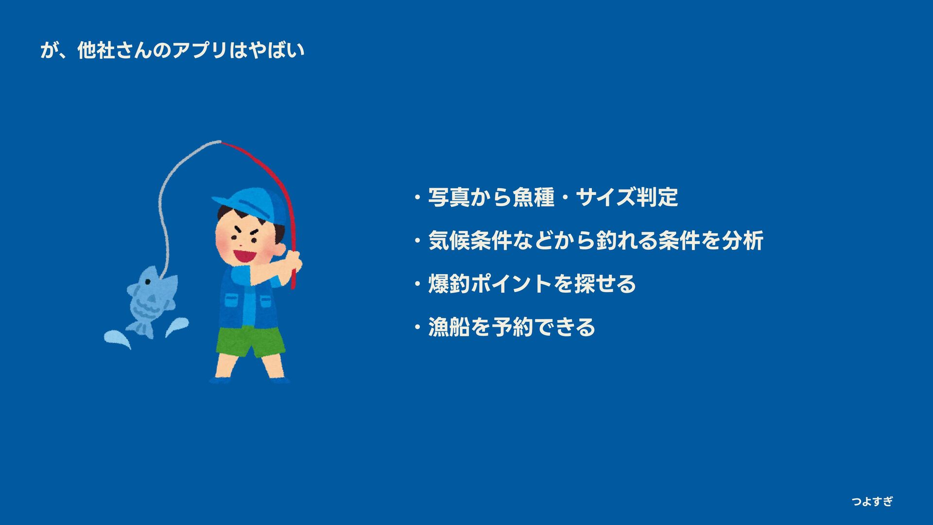 が、他社さんのアプリはやばい つよすぎ ・写真から魚種・サイズ判定 ・気候条件などから釣れる条件を分析 ・爆釣ポイントを探せる ・漁船を予約できる