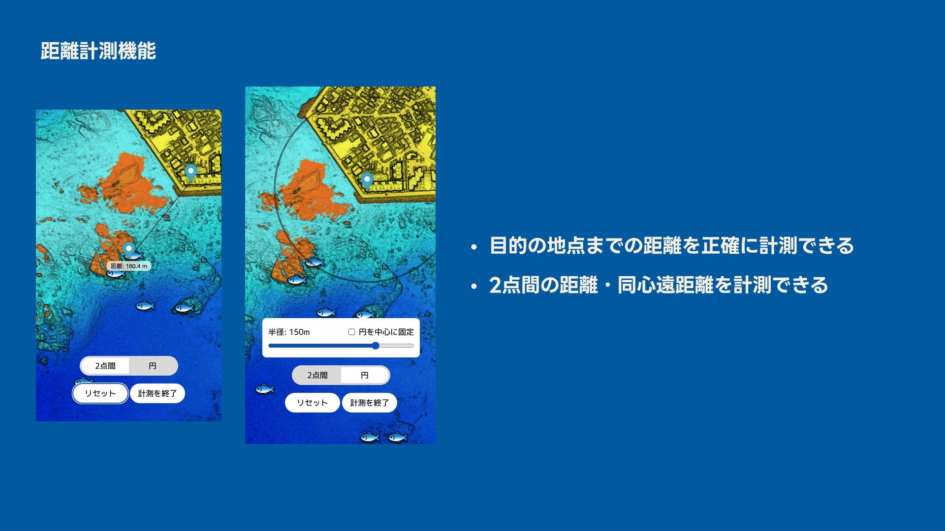 距離計測機能 目的の地点までの距離を正確に計測できる 2点間の距離・同心遠距離を計測できる