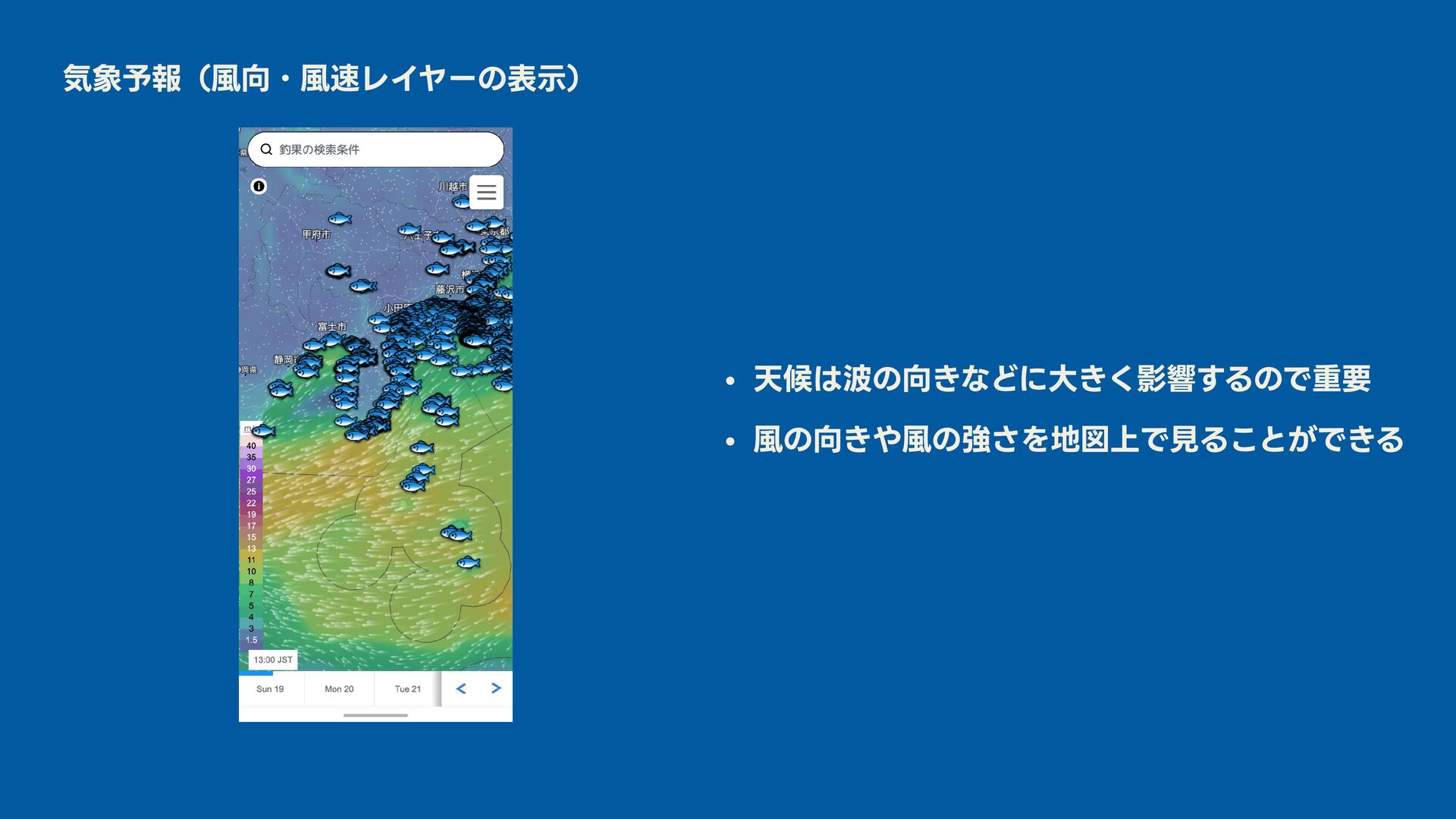 気象予報(風向・風速レイヤーの表示) 天候は波の向きなどに大きく影響するので重要 風の向きや風の強さを地図上で見ることができる
