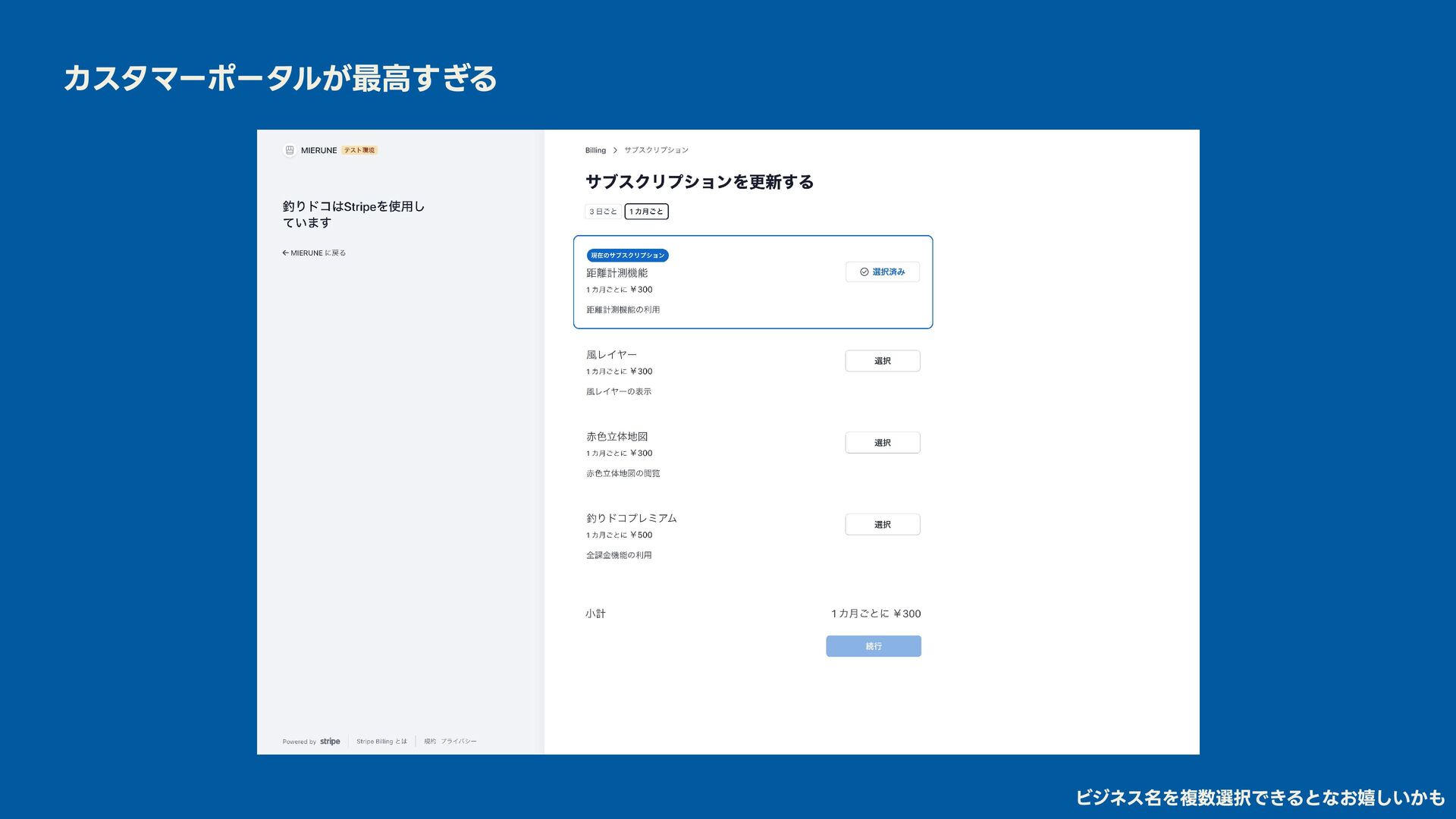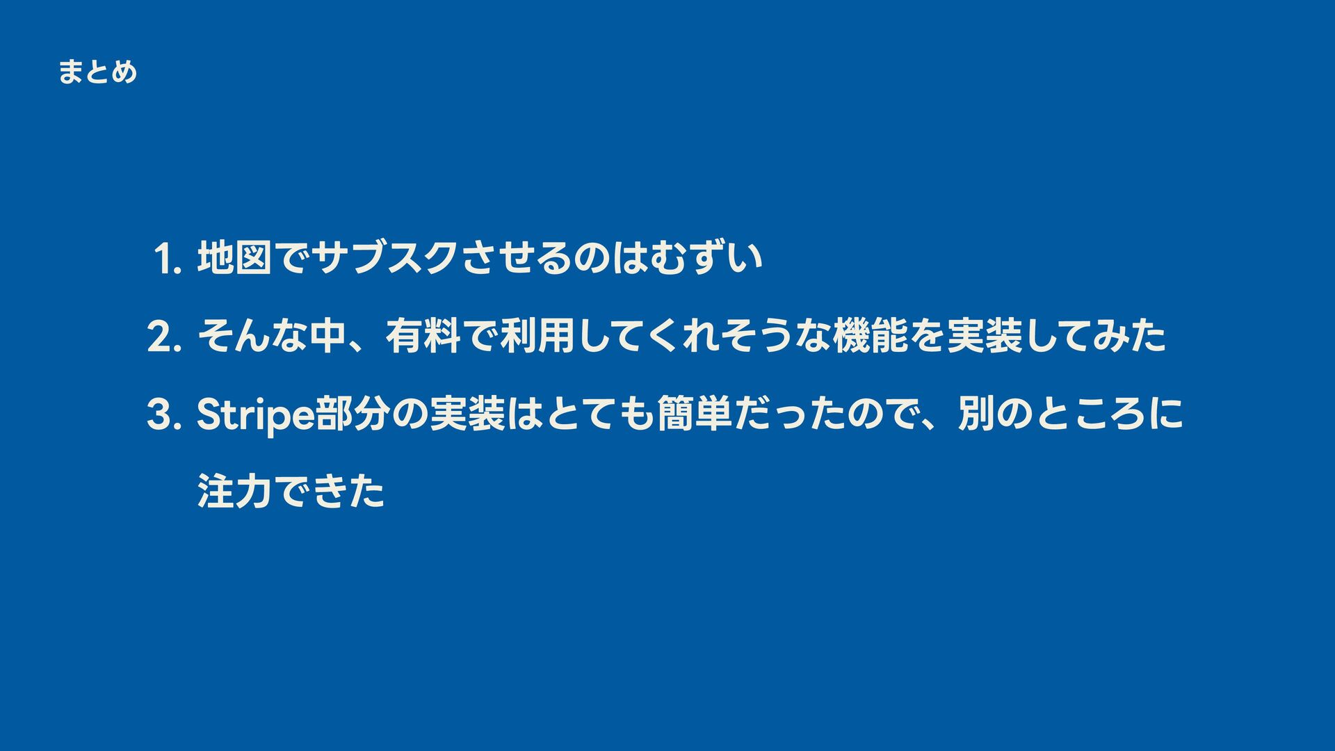 まとめ 地図でサブスクさせるのはむずい そんな中、有料で利用してくれそうな機能を実装してみた Stripe部分の実装はとても簡単だったので、別のところに 注力できた