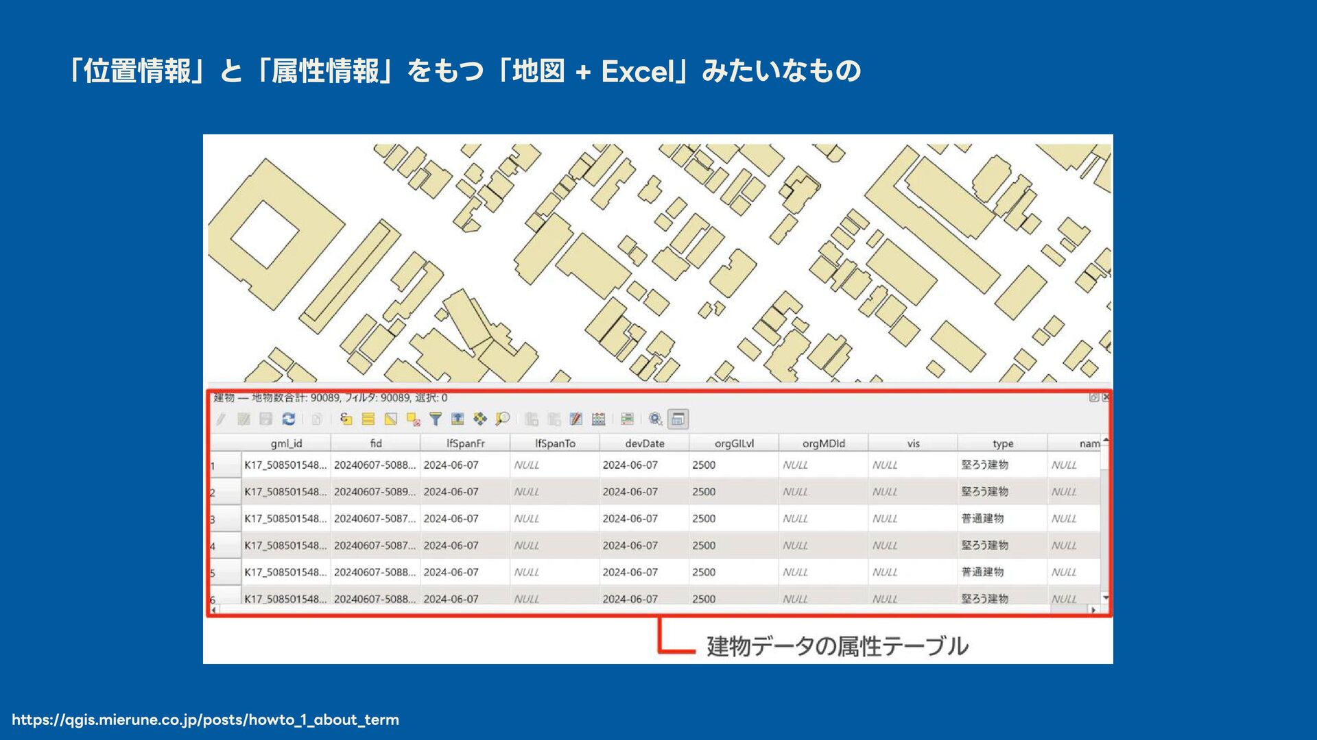 「位置情報」と「属性情報」をもつ「地図 + Excel」みたいなもの https://qgis.mierune.co.jp/posts/howto_1_about_term