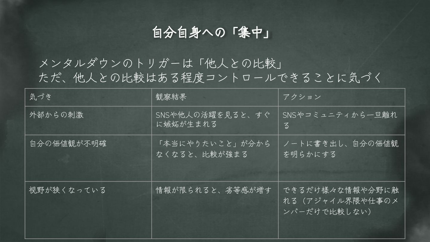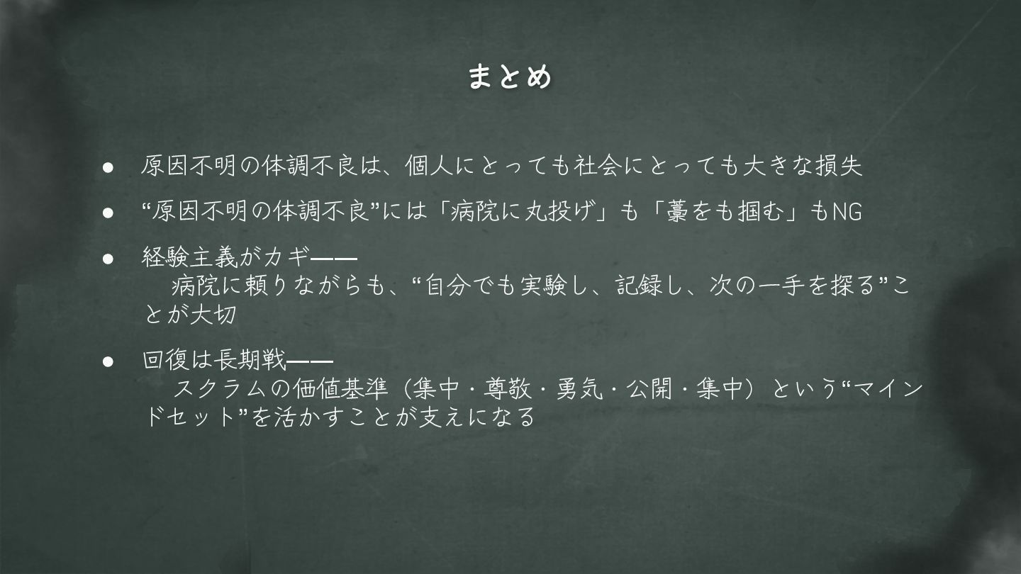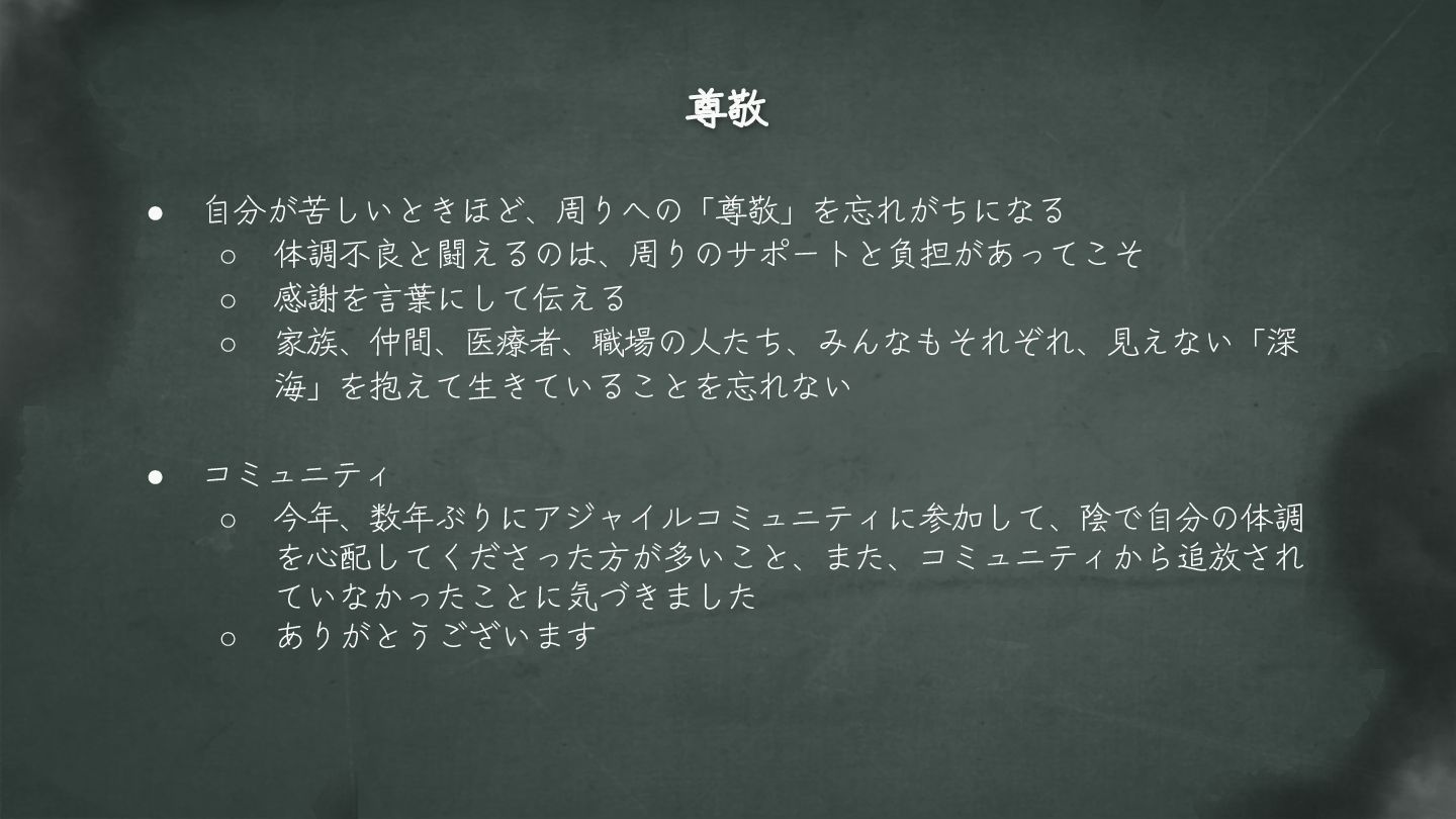 本資料はスクラムフェス三河2025の登壇資料 です。 病気や不調で動けなかった体験を、スクラムの考え方をセルフケアに応用することで振り返りました。 仏典の「足るを知る」や「病気と借金は不足である」という視点、さらにメンタル不調に関する調査データも織り交ぜながら、回復プロセスを共有しています。 スプリントの経験主義や価値基準という原則が、日常の回復や再生にどう役立ったかを紹介します。