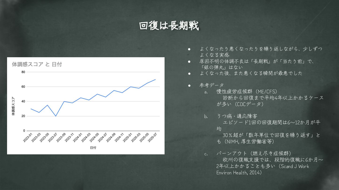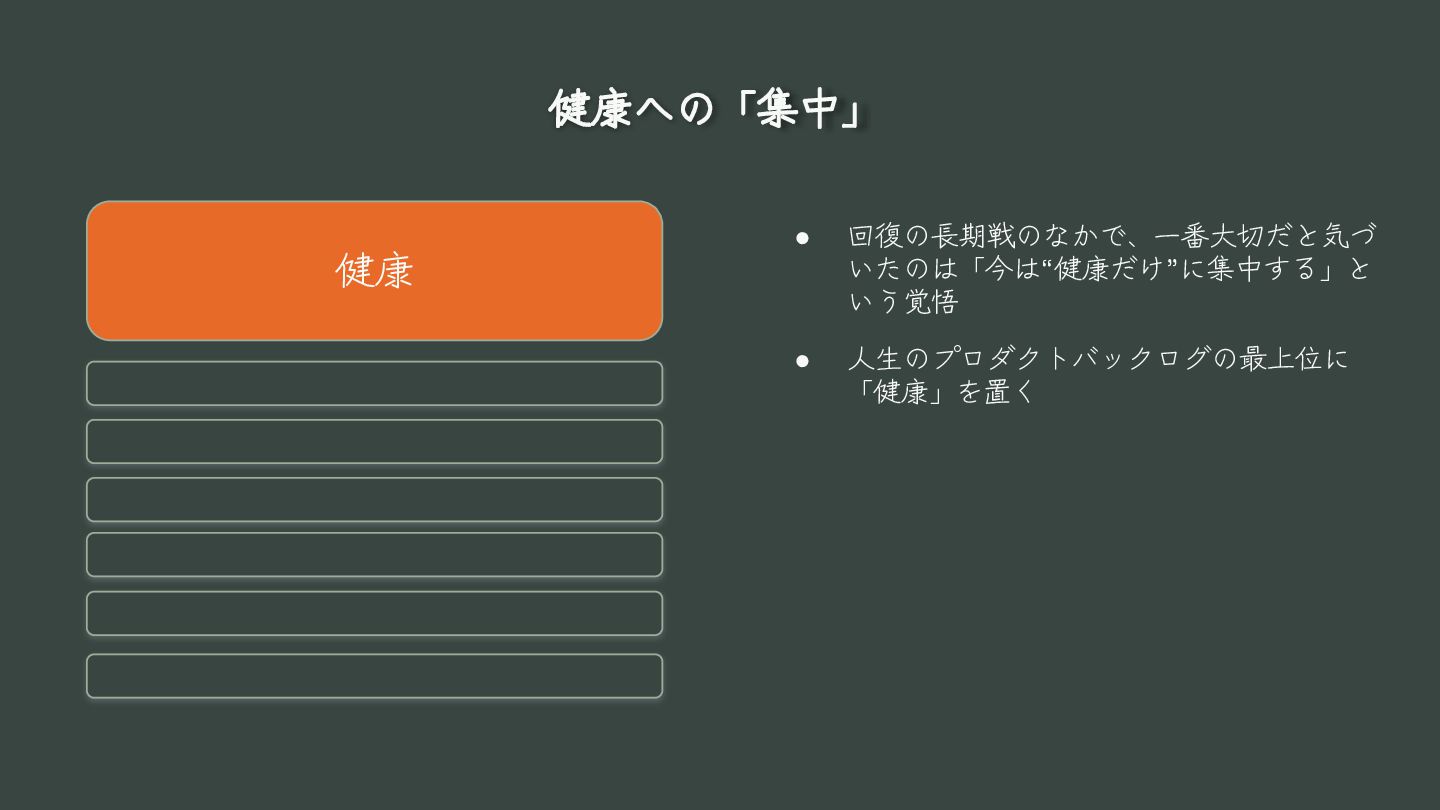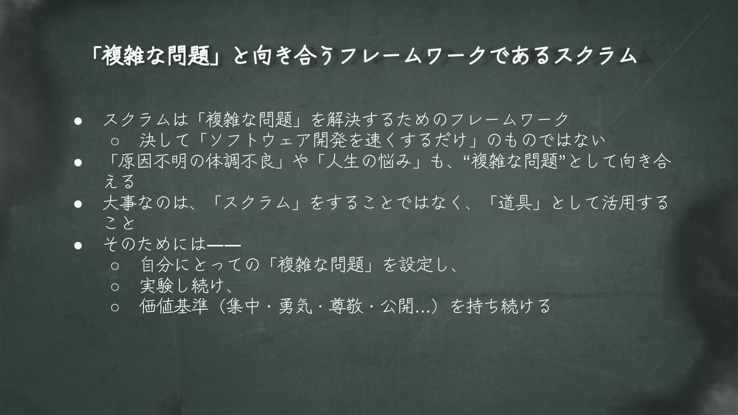 本資料はスクラムフェス三河2025の登壇資料 です。 病気や不調で動けなかった体験を、スクラムの考え方をセルフケアに応用することで振り返りました。 仏典の「足るを知る」や「病気と借金は不足である」という視点、さらにメンタル不調に関する調査データも織り交ぜながら、回復プロセスを共有しています。 スプリントの経験主義や価値基準という原則が、日常の回復や再生にどう役立ったかを紹介します。