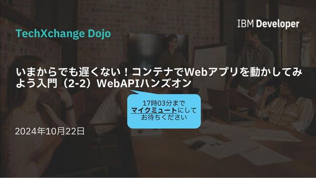 © 2024 IBM Corporation 1 いまからでも遅くない!コンテナでWebアプリを動かしてみ よう入門(2-2)WebAPIハンズオン TechXchange Dojo 2024年10月22日