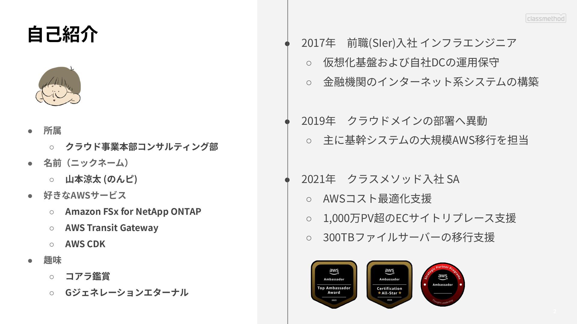 2019年 クラウドメインの部署へ異動 ◦ 主に基幹システムの⼤規模AWS移⾏を担当 • 2021年 クラスメソッド⼊社 SA ◦ AWSコスト最適化⽀援 ◦ 1,000万PV超のECサイトリプレース⽀援 ◦ 300TBファイルサーバーの移⾏⽀援 • 所属 ◦ クラウド事業本部コンサルティング部 • 名前(ニックネーム) ◦ ⼭本涼太 (のんピ) • 好きなAWSサービス ◦ Amazon FSx for NetApp ONTAP ◦ AWS Transit Gateway ◦ AWS CDK • 趣味 ◦ コアラ鑑賞 ◦ Gジェネレーションエターナル