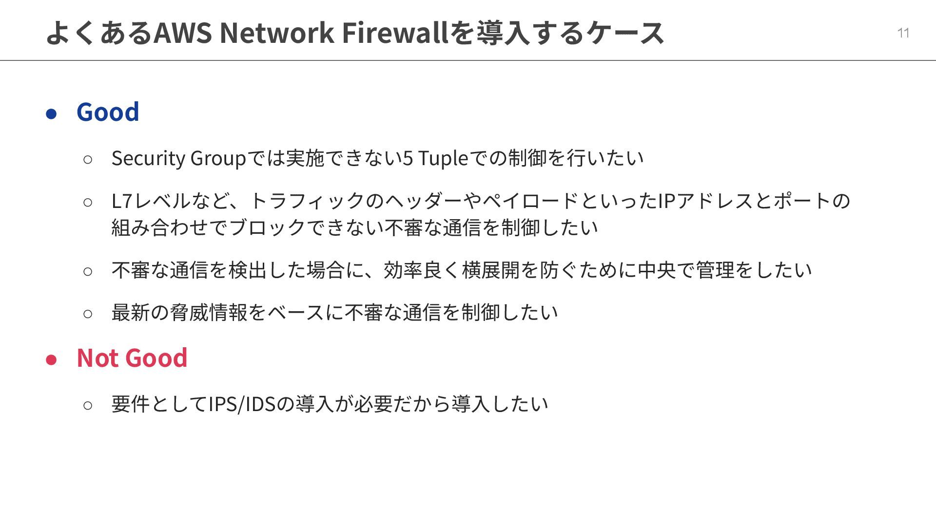 よくあるAWS Network Firewallを導⼊するケース 11 • Good ◦ Security Groupでは実施できない5 Tupleでの制御を⾏いたい