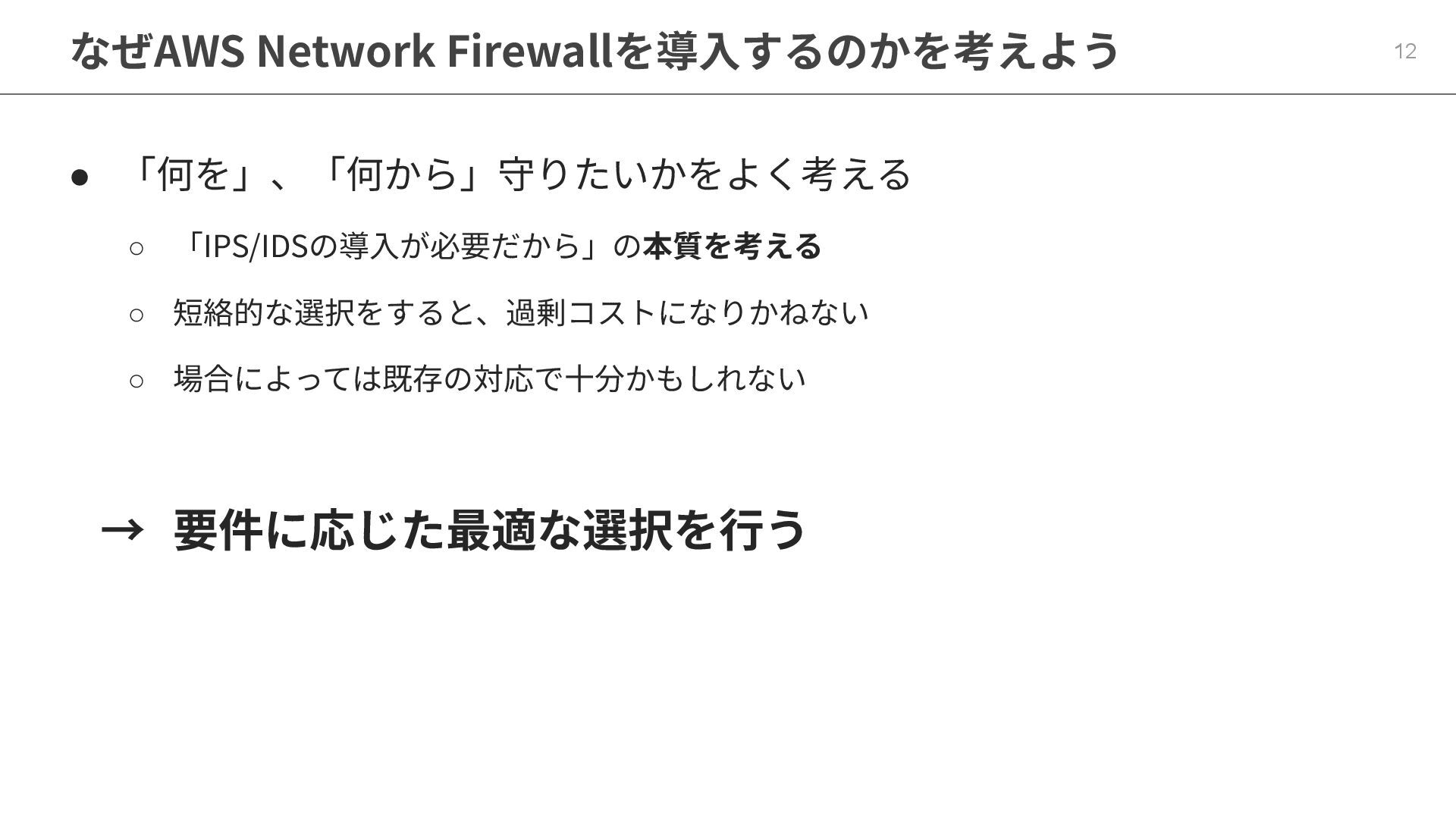 なぜAWS Network Firewallを導⼊するのかを考えよう 12 • 「何を」、「何から」守りたいかをよく考える ◦ 「IPS/IDSの導⼊が必要だから」の本質を考える ◦ 短絡的な選択をすると、過剰コストになりかねない