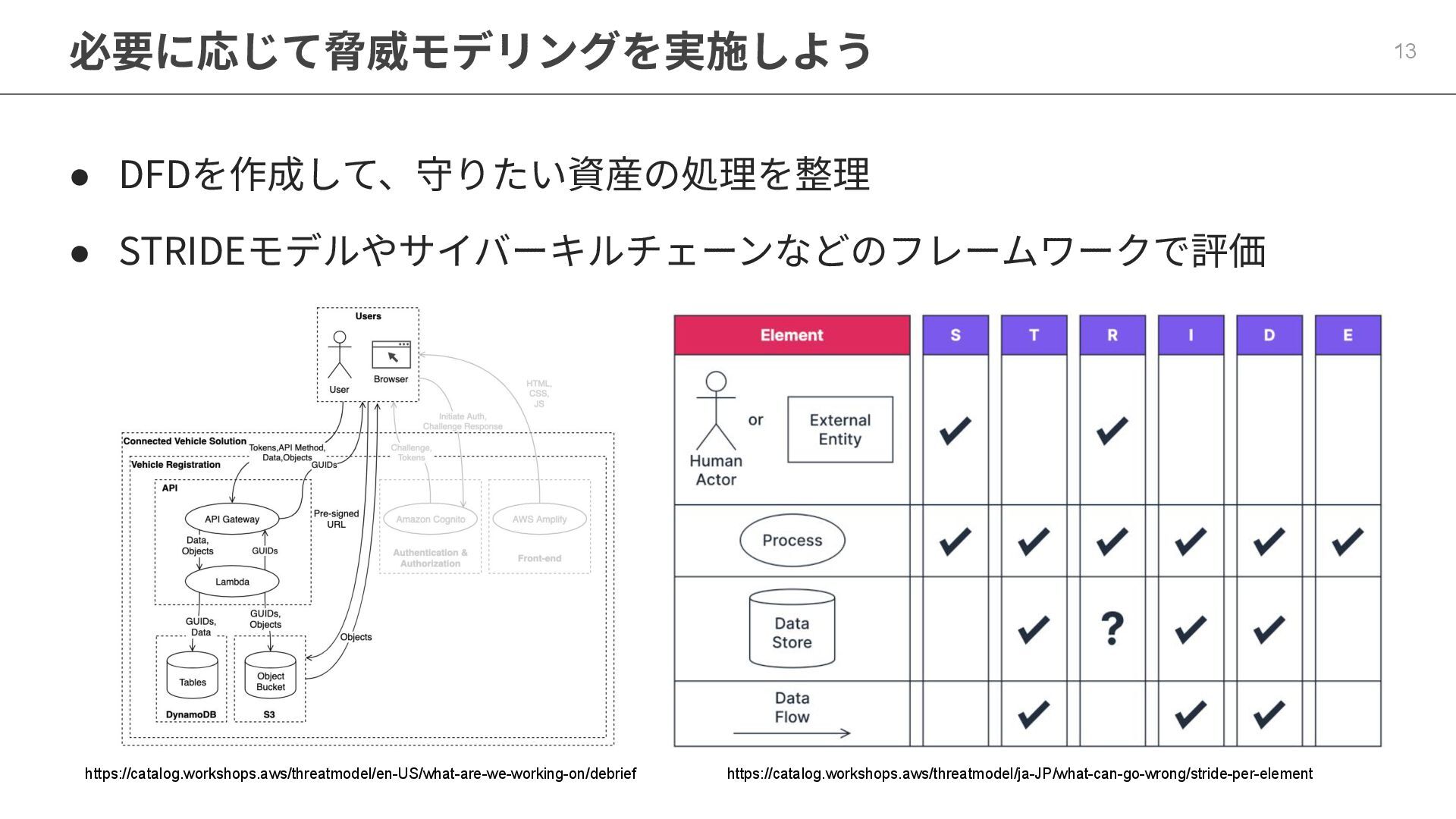 必要に応じて脅威モデリングを実施しよう 13 • DFDを作成して、守りたい資産の処理を整理 • STRIDEモデルやサイバーキルチェーンなどのフレームワークで評価 https://catalog.workshops.aws/threatmodel/en-US/what-are-we-working-on/debrief https://catalog.workshops.aws/threatmodel/ja-JP/what-can-go-wrong/stride-per-element