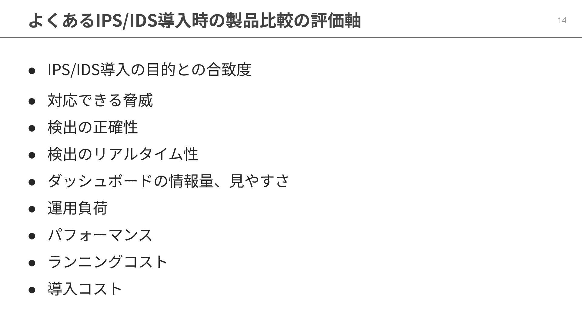 よくあるIPS/IDS導⼊時の製品⽐較の評価軸 14 • IPS/IDS導⼊の⽬的との合致度 • 対応できる脅威 • 検出の正確性 • 検出のリアルタイム性
