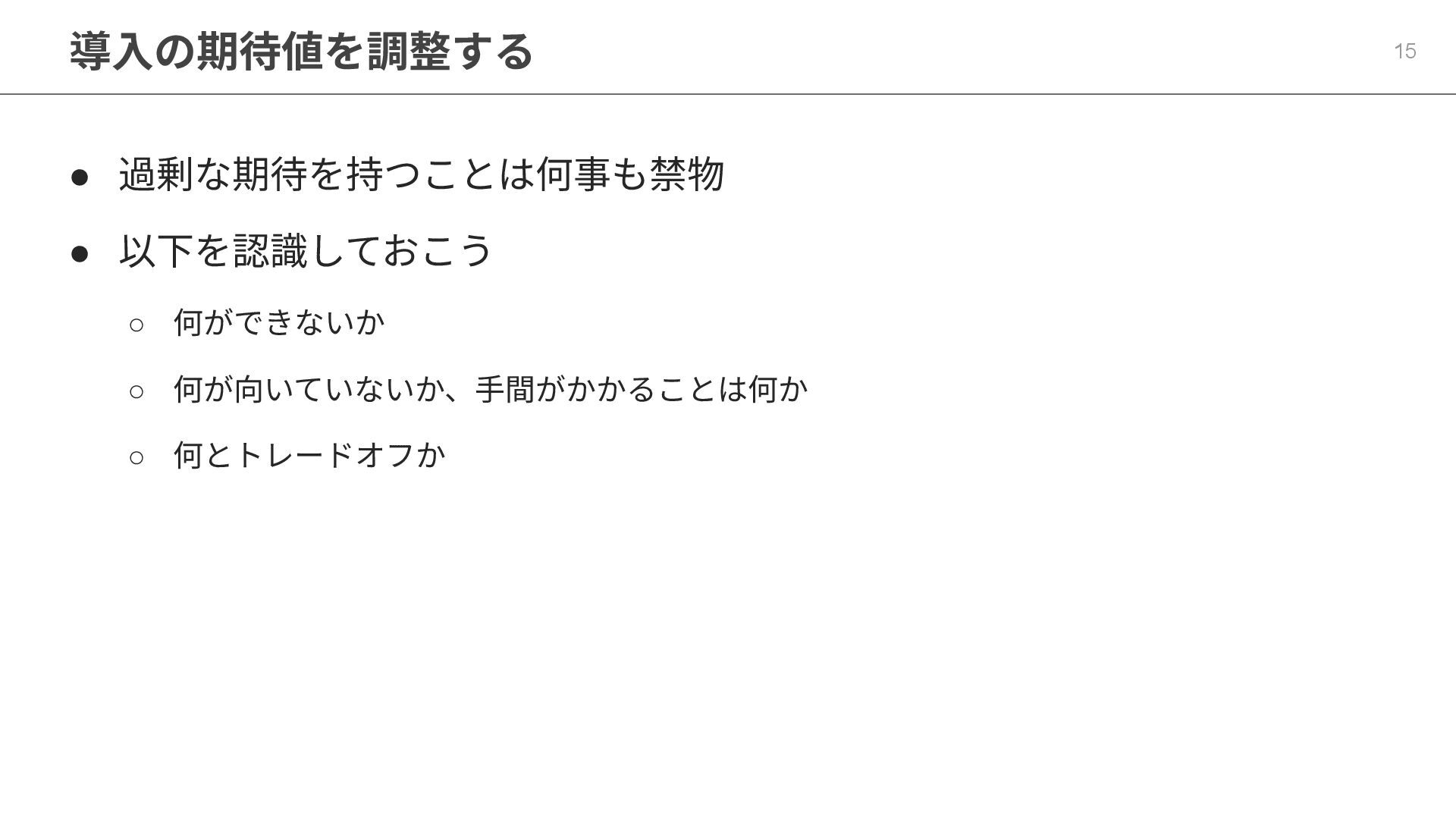 導⼊の期待値を調整する 15 • 過剰な期待を持つことは何事も禁物 • 以下を認識しておこう ◦ 何ができないか ◦ 何が向いていないか、⼿間がかかることは何か