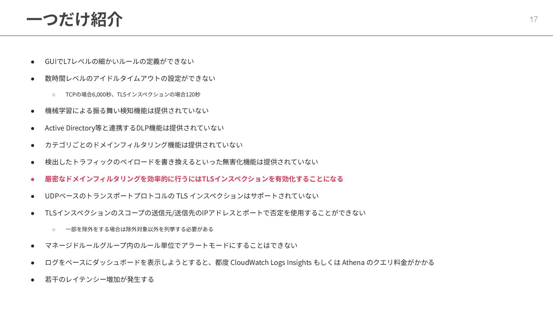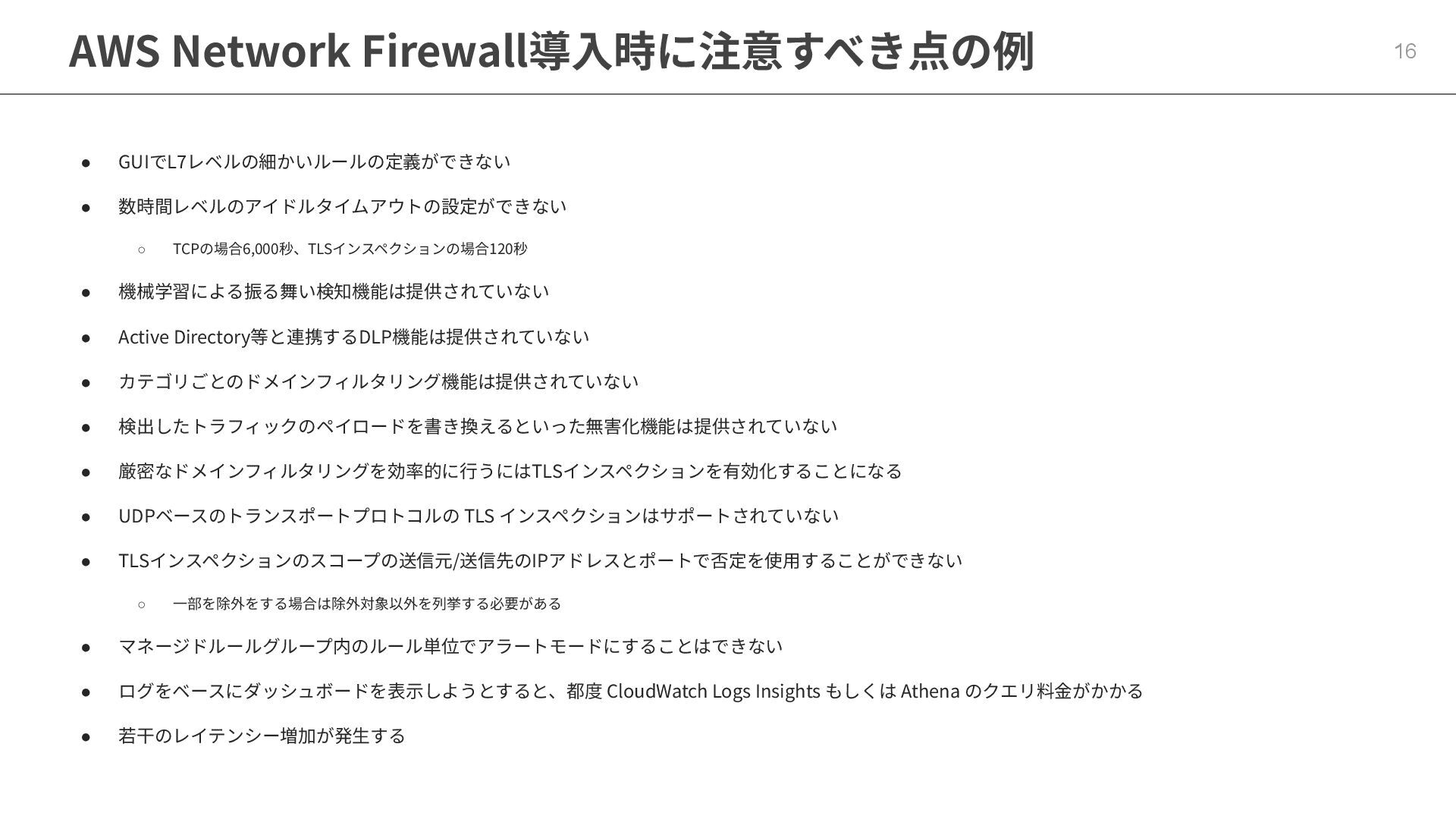 • 機械学習による振る舞い検知機能は提供されていない • Active Directory等と連携するDLP機能は提供されていない • カテゴリごとのドメインフィルタリング機能は提供されていない • 検出したトラフィックのペイロードを書き換えるといった無害化機能は提供されていない • 厳密なドメインフィルタリングを効率的に⾏うにはTLSインスペクションを有効化することになる • UDPベースのトランスポートプロトコルの TLS インスペクションはサポートされていない • TLSインスペクションのスコープの送信元/送信先のIPアドレスとポートで否定を使⽤することができない ◦ ⼀部を除外をする場合は除外対象以外を列挙する必要がある • マネージドルールグループ内のルール単位でアラートモードにすることはできない • ログをベースにダッシュボードを表⽰しようとすると、都度 CloudWatch Logs Insights もしくは Athena のクエリ料⾦がかかる • 若⼲のレイテンシー増加が発⽣する