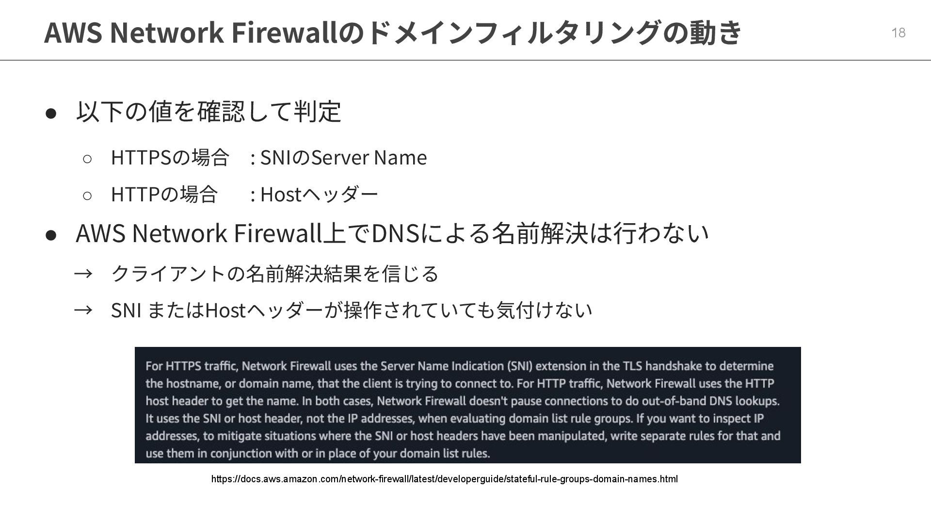 Name ◦ HTTPの場合 : Hostヘッダー • AWS Network Firewall上でDNSによる名前解決は⾏わない → クライアントの名前解決結果を信じる → SNI またはHostヘッダーが操作されていても気付けない https://docs.aws.amazon.com/network-firewall/latest/developerguide/stateful-rule-groups-domain-names.html
